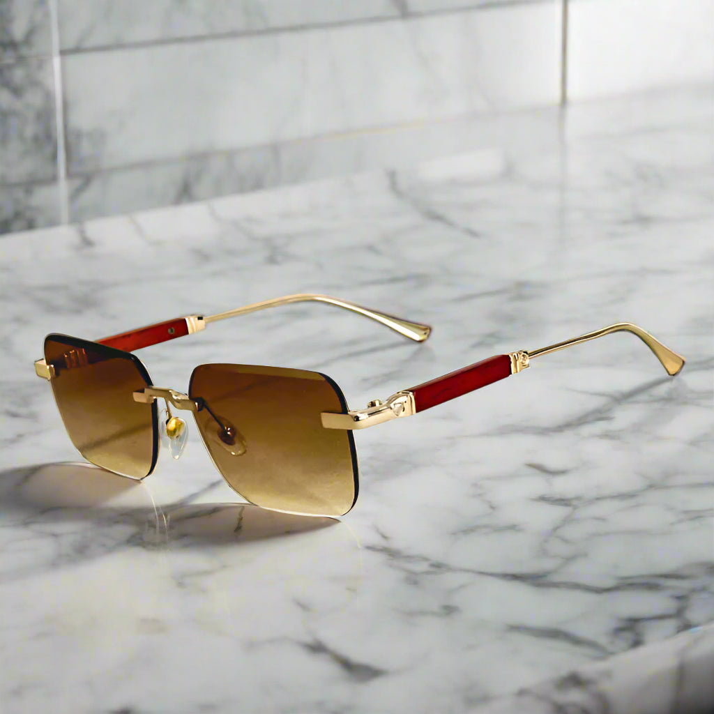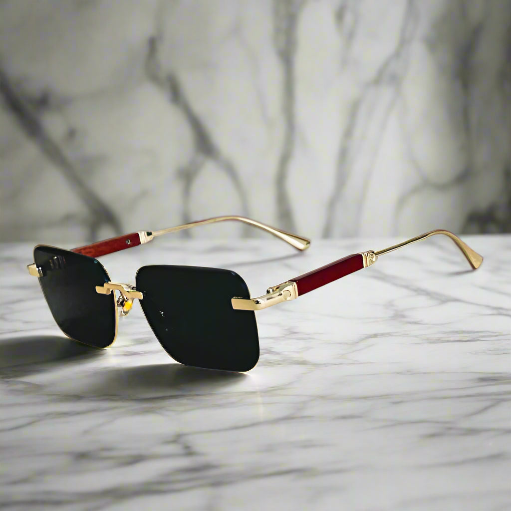 Комплект модерни правоъгълни слънчеви очила с елегантни златни детайли и тонирани стъкла. Уникалната комбинация от цветове и материали на рамката придава луксозен вид, докато формата е лека и удобна. Перфектни за повдигане на всяко облекло с нотка на елегантност.
