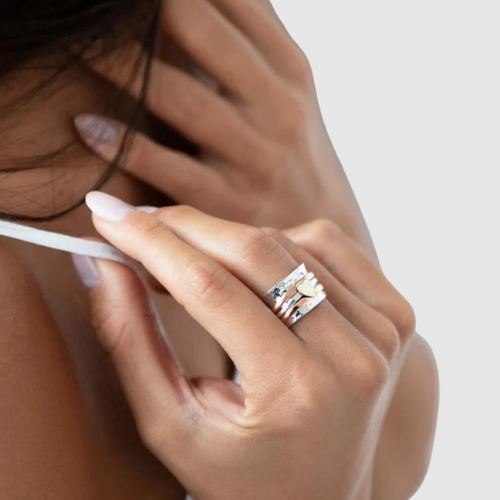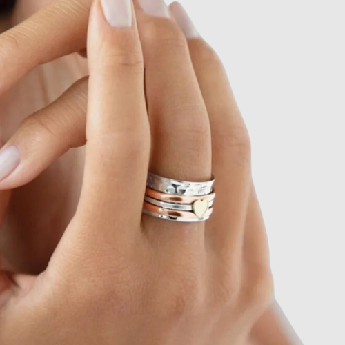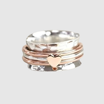 Този елегантен пръстен комбинира няколко метални слоя в златисто и сребристо, завършени с малко сърце в центъра – израз на нежност и хармония.