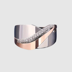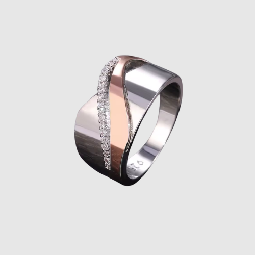 Този пръстен комбинира сребрист и розово-златист нюанс за елегантен контраст. Деликатният ред от кристали придава изискан блясък, без да натрапва.