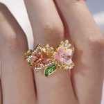 Този изящен пръстен улавя красотата на пролетта чрез деликатни пеперуди и цветя в розово и златно. Изработен с внимание към всеки детайл, той носи усещане за нежност и женственост.