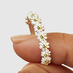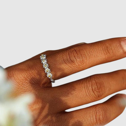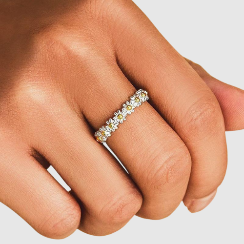 Този очарователен пръстен е изработен с деликатни малки цветя маргаритки, символ на чистота и ново начало. Сребристият завършек и внимателните детайли му придават изтънчен, женствен чар. Перфектен подарък за себе си или за любим човек.