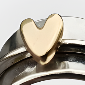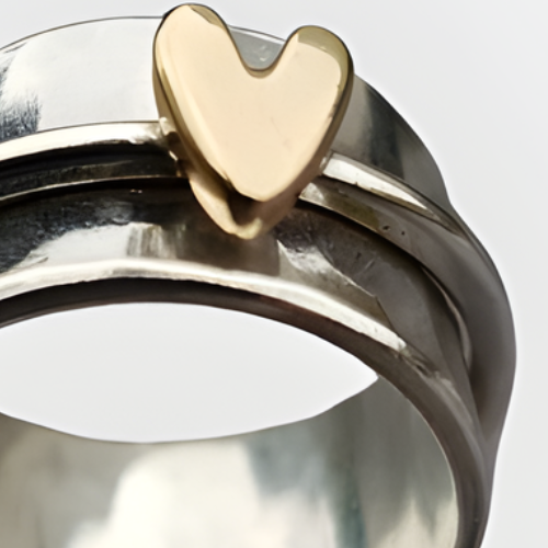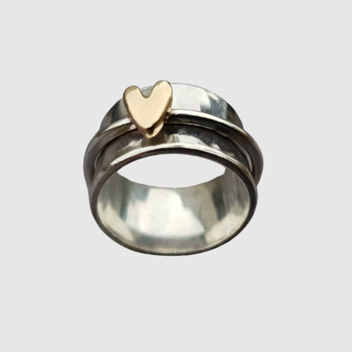 Този изискан пръстен съчетава сребърна основа с малко златно сърце – минималистичен, но с дълбок смисъл. Подходящ както за ежедневие, така и като подарък с лично послание.