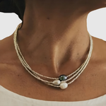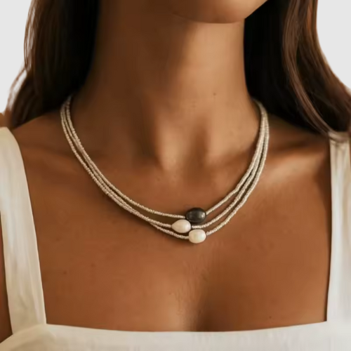 Това колие съчетава изтънчена простота и изискан детайл. Перлените нишки придават фин блясък, докато тъмният камък в центъра създава контраст и хармония.