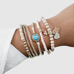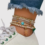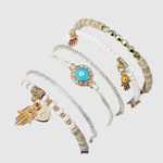 Този изискан комплект комбинира няколко гривни в нежни златни, бели и тюркоазени нюанси. Всяка гривна е украсена с детайли, които създават усещане за хармония, свобода и женственост. Перфектен избор както за летни дни, така и за ежедневен шик стил.