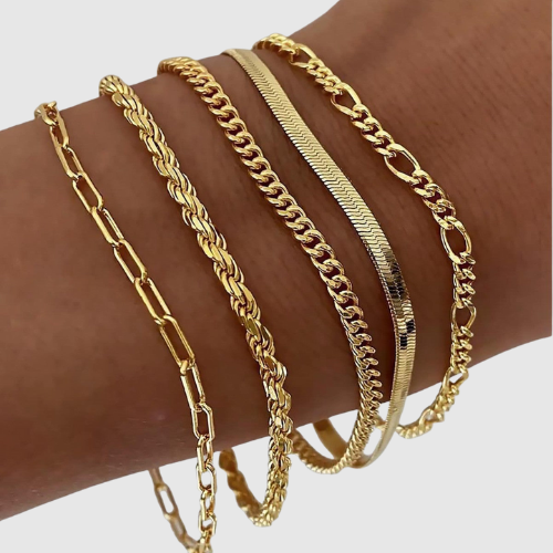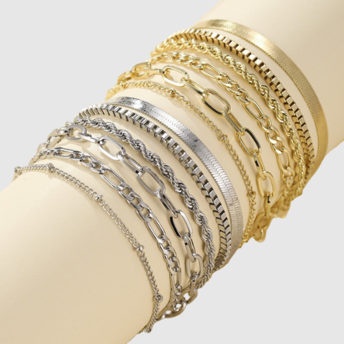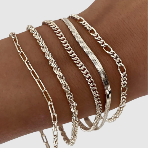 Този комплект включва няколко елегантни гривни с различни верижни дизайни, които могат да се носят както заедно, така и поотделно. Идеални за ежедневно носене или специални поводи.