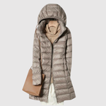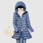 Тази якета комбинира лекота и топлина в стилен дизайн. Отделящата се качулка с пухкава периферия и блестящото покритие я правят перфектна за градския живот и спокойни дни.