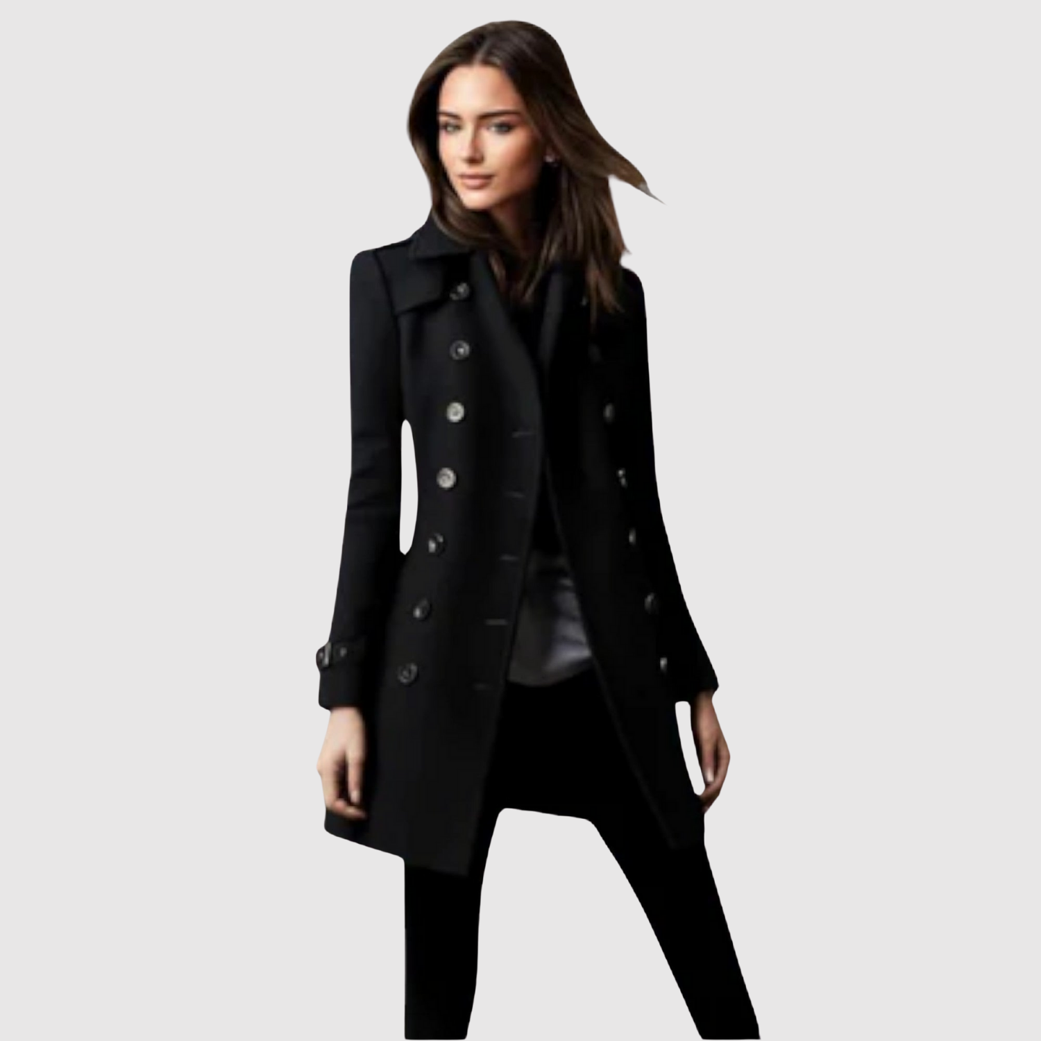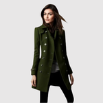 Тази фигурално изработена палто излъчва сила и стил. Декоративните златисти копчета и изразителните рамене създават елегантен и мощен вид – идеално за вас, които искате да се откроявате.