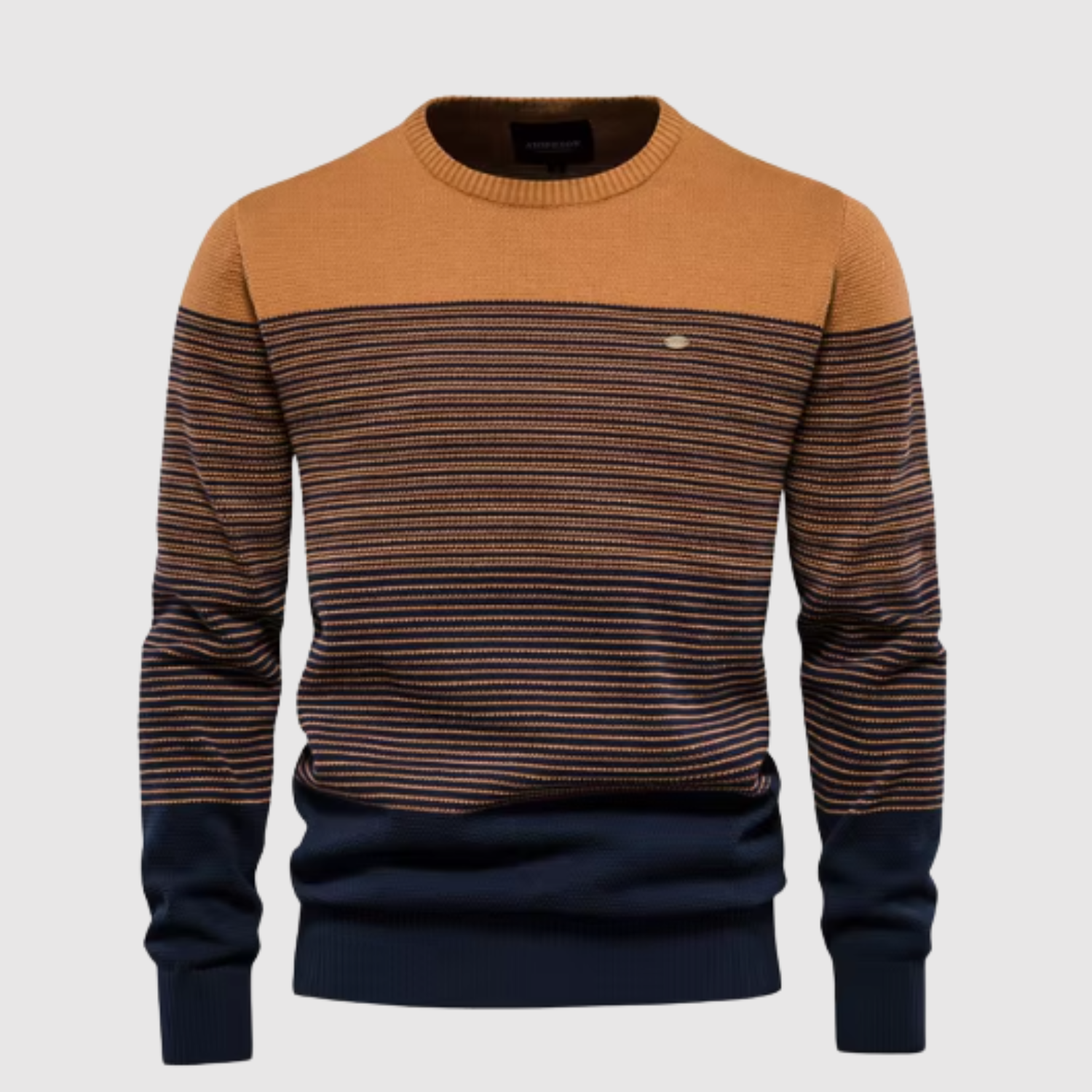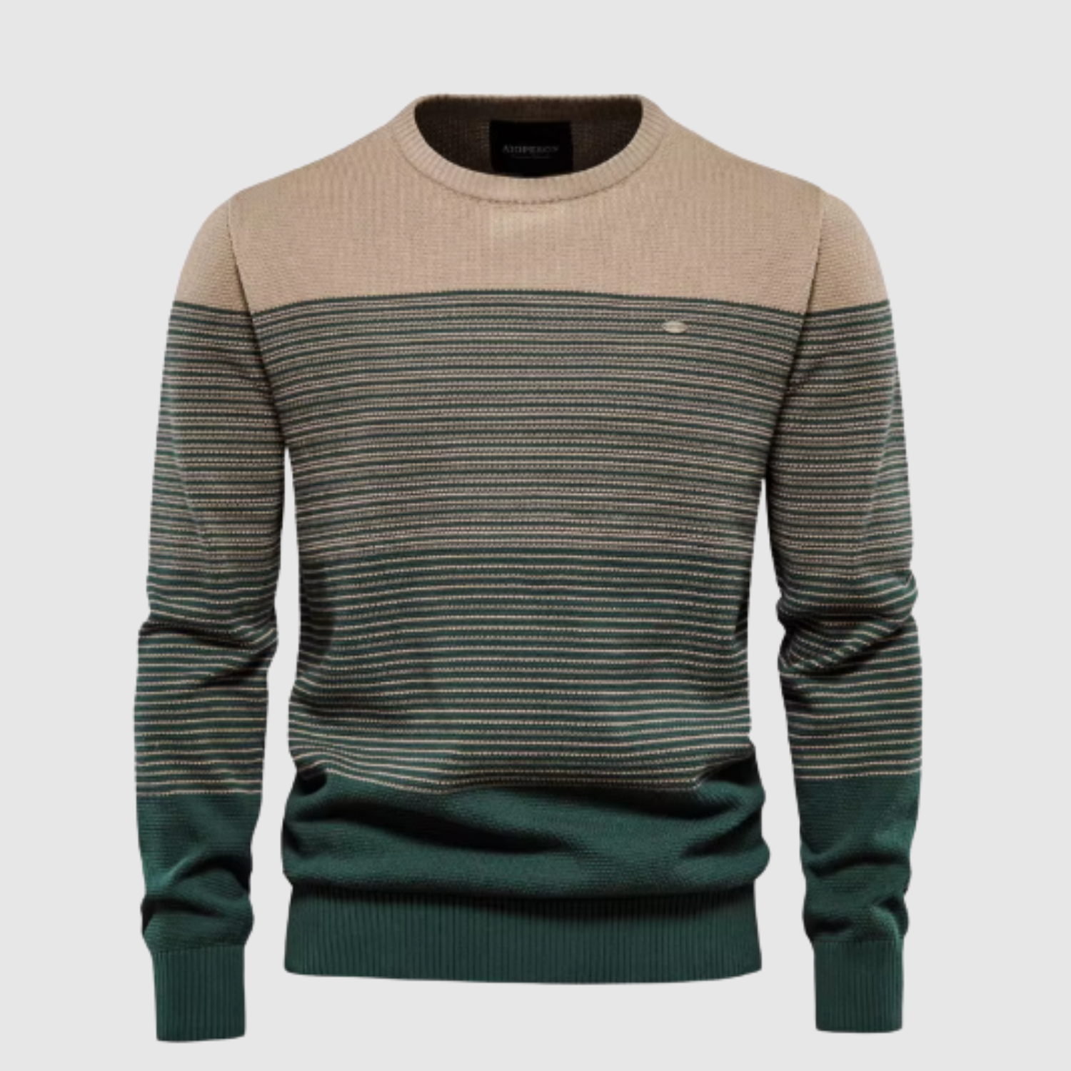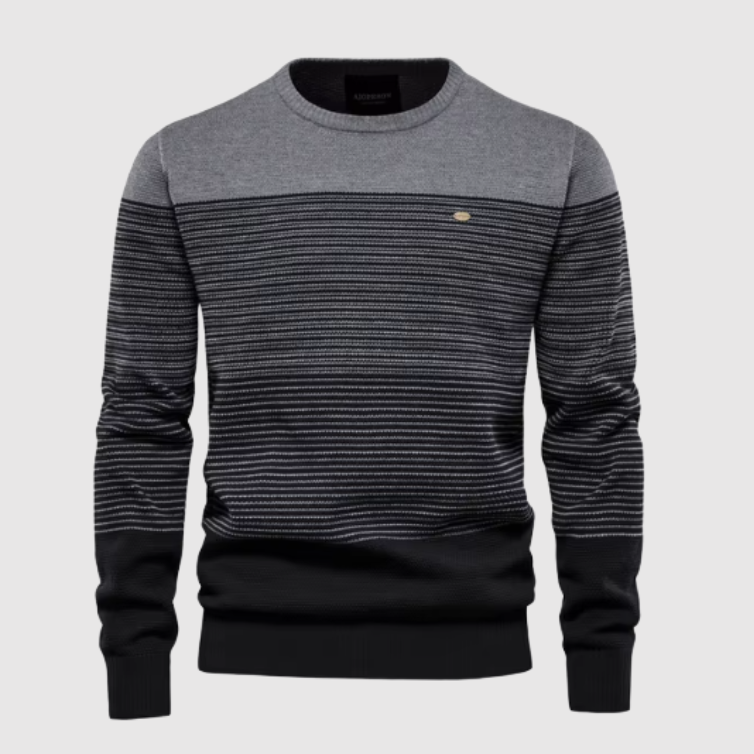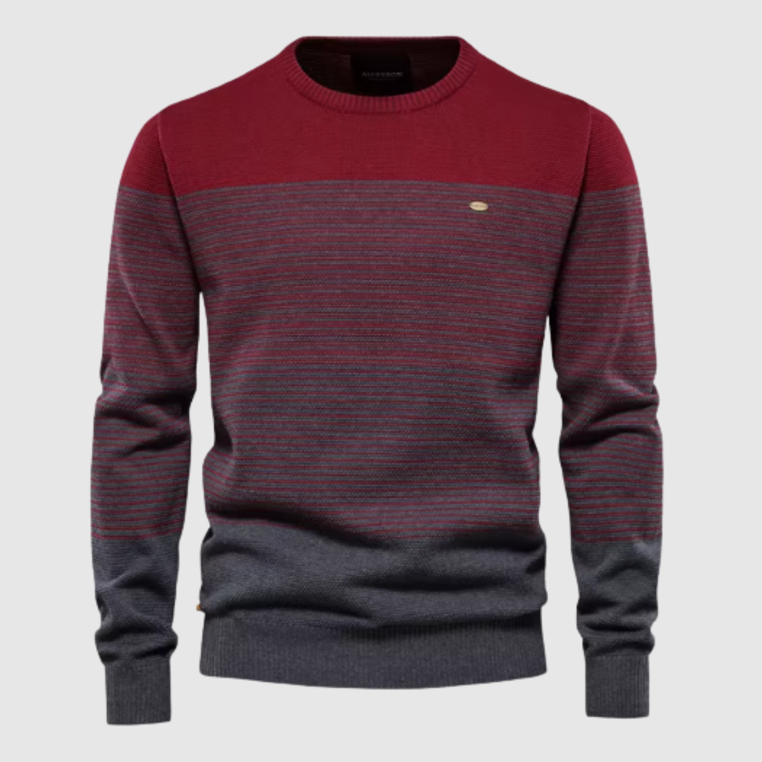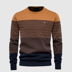 Този пуловер комбинира класически вид с модерни ивици, които придават елегантен и неформален вид. Перфектен за офиса и свободното време, когато искате стилно и удобно облекло.