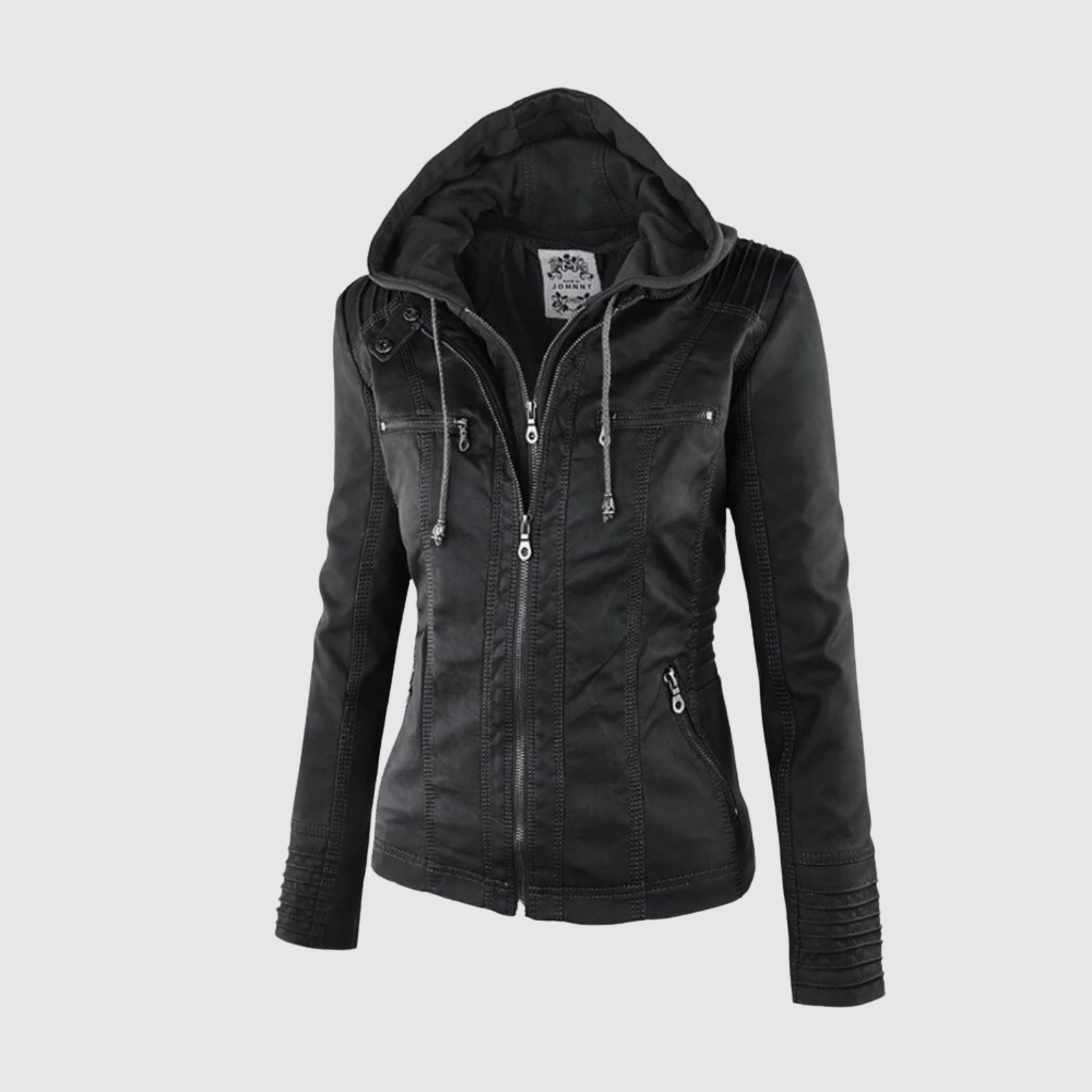 Тази дамска яке комбинира модерен кожен вид с практични детайли като качулка и джобове с цип. Фигураното кроене подчертава силуета, докато мекото материало осигурява комфорт през целия ден. Перфектно за ежедневна употреба и вечерни излизания, когато искате женствен вид с нотка на атитюд.