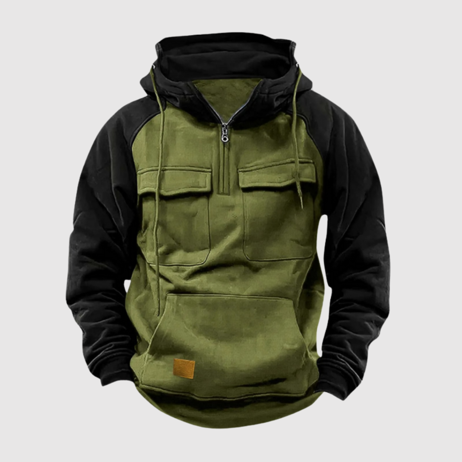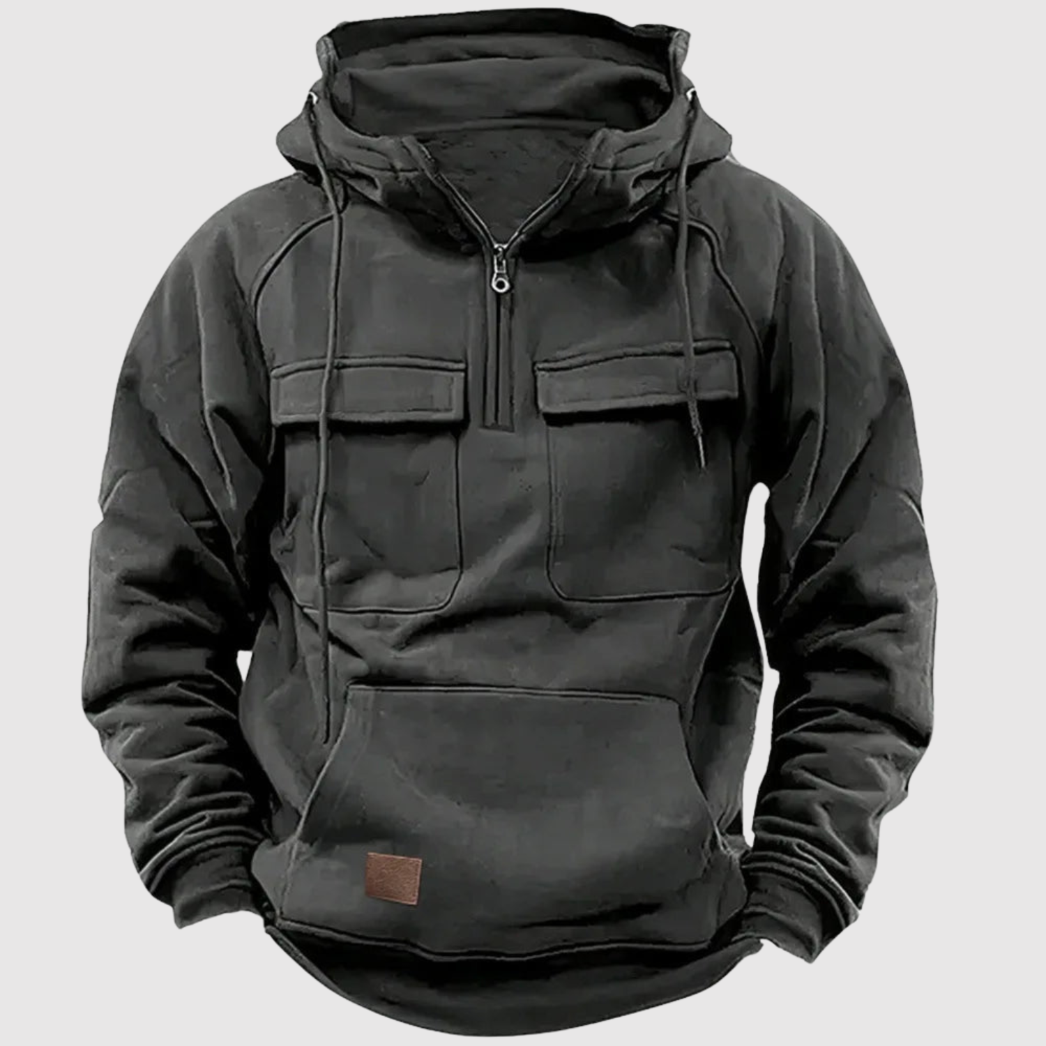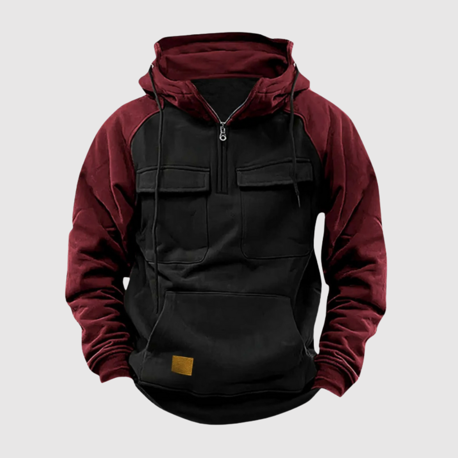 Този суитшърт с качулка комбинира мъжествен външен вид с удобна кройка. Голямата предна джоб предлага стил и функция, докато меката материя ви държи топло в студените дни. Перфектен за всекидневие, свободно време и дейности на открито.