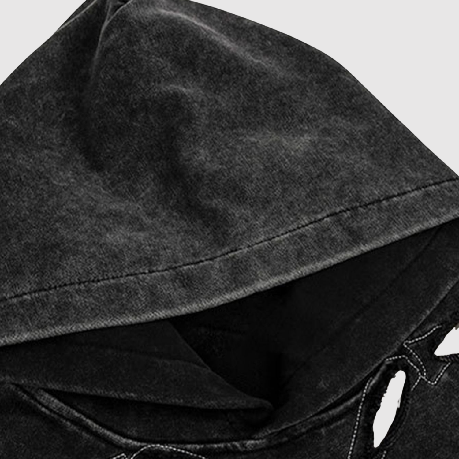 Изразително худи с отличителни изрязани детайли на гърба, което придава остър и уникален вид. Свободната кройка в комбинация с мека памучна смес го прави както удобно, така и стилно. Перфектно за стрийт уър и ежедневно носене.