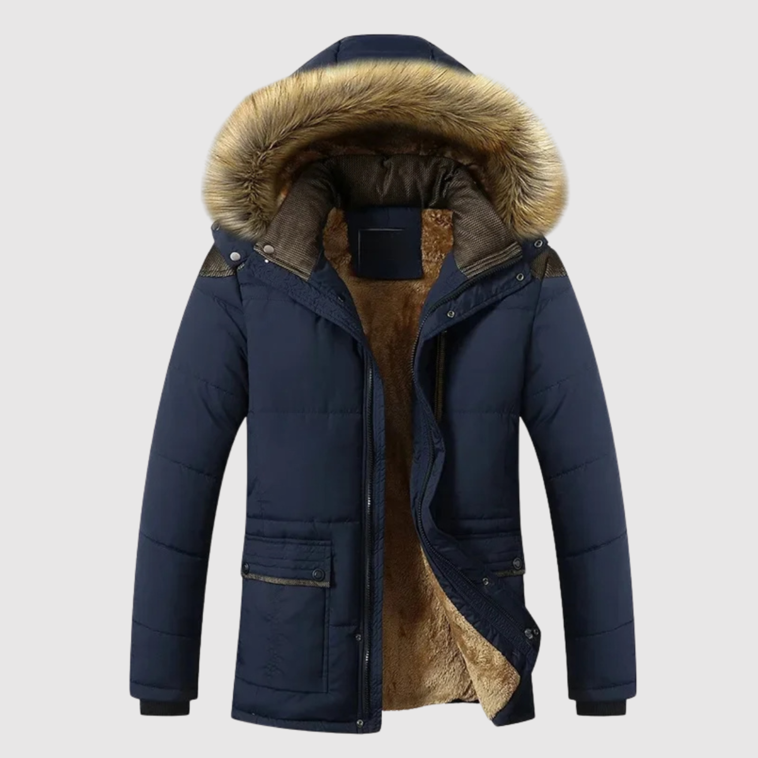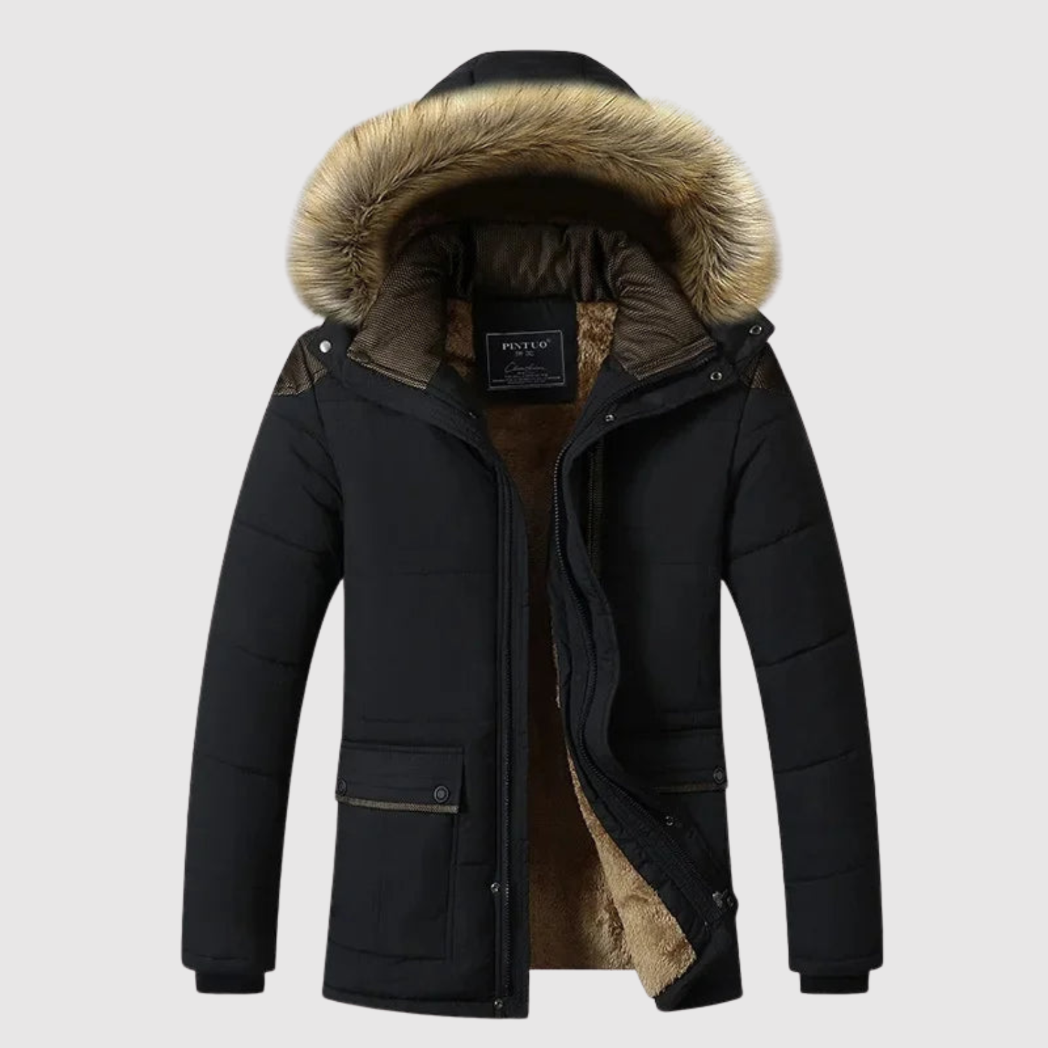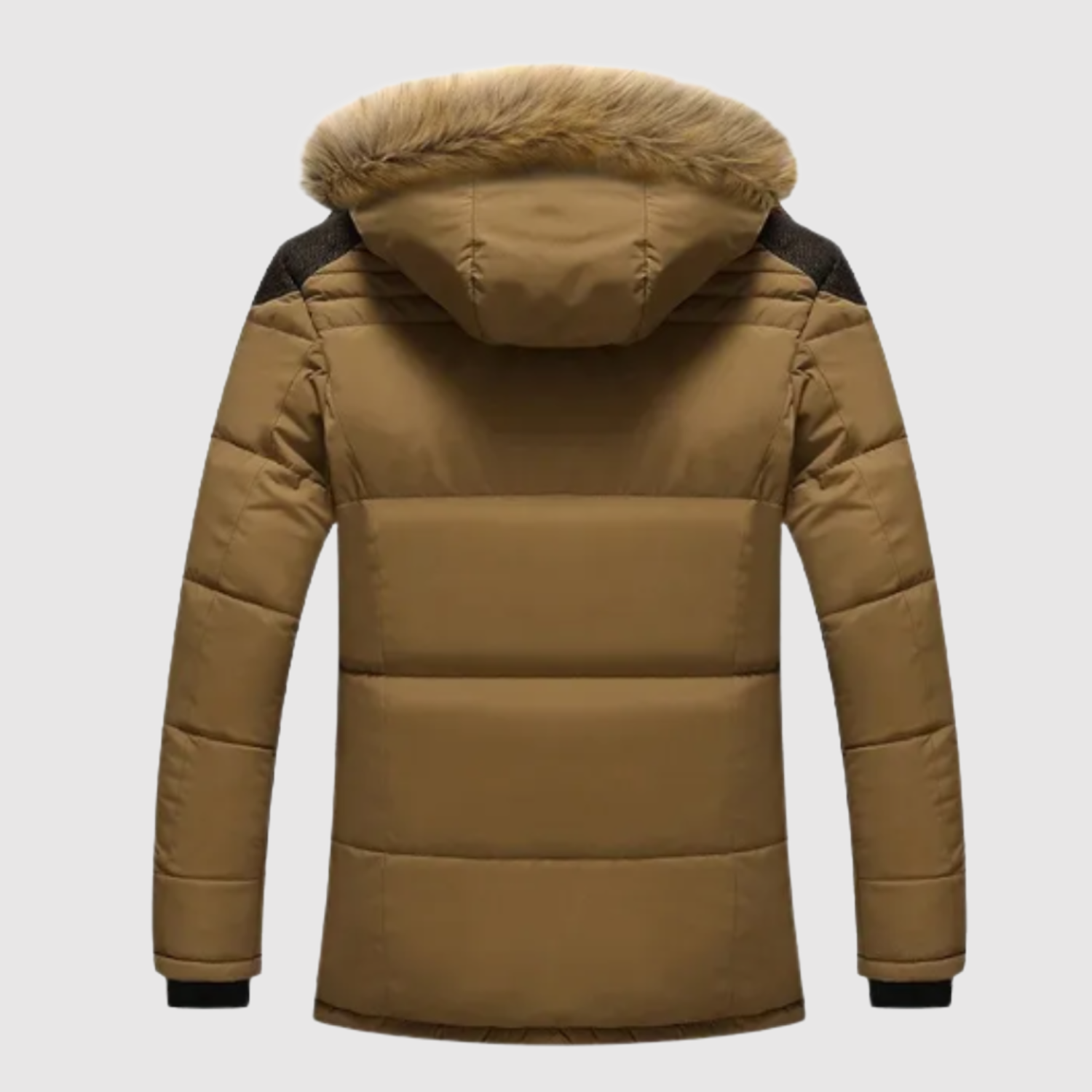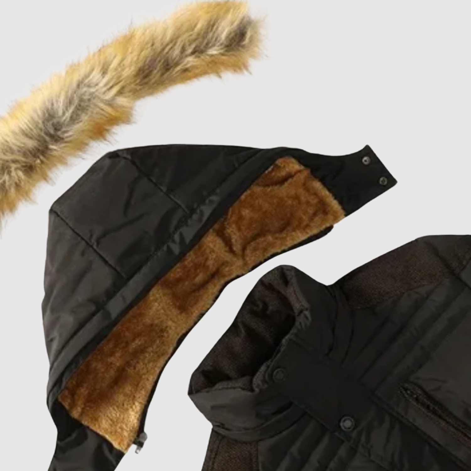 Това зимно яке е проектирано за студените дни, когато комфортът е приоритет. Меката подплата от изкуствен косъм осигурява отлична изолация, а пухената качулка добавя луксозен акцент и защита от вятър. Перфектен избор за ежедневна визия със стил.