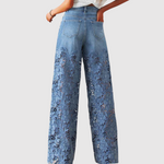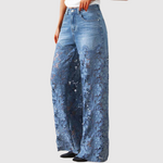 Тези дънки комбинират класически деним с красиви цветни бродерии, които придават женствено и артистично излъчване. Широкият силует осигурява комфорт и свобода на движението, перфектни както за ежедневно носене, така и за специални поводи.