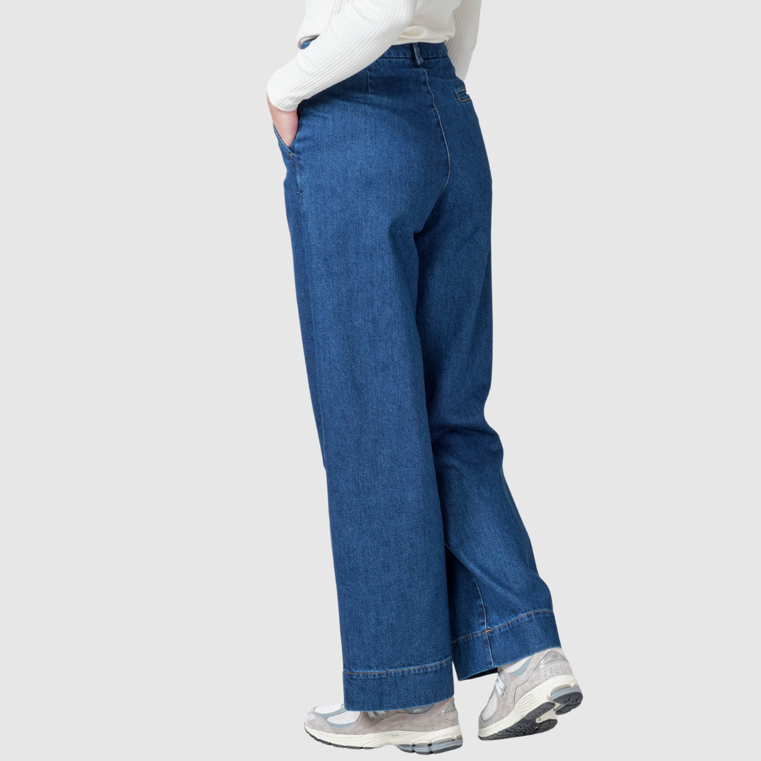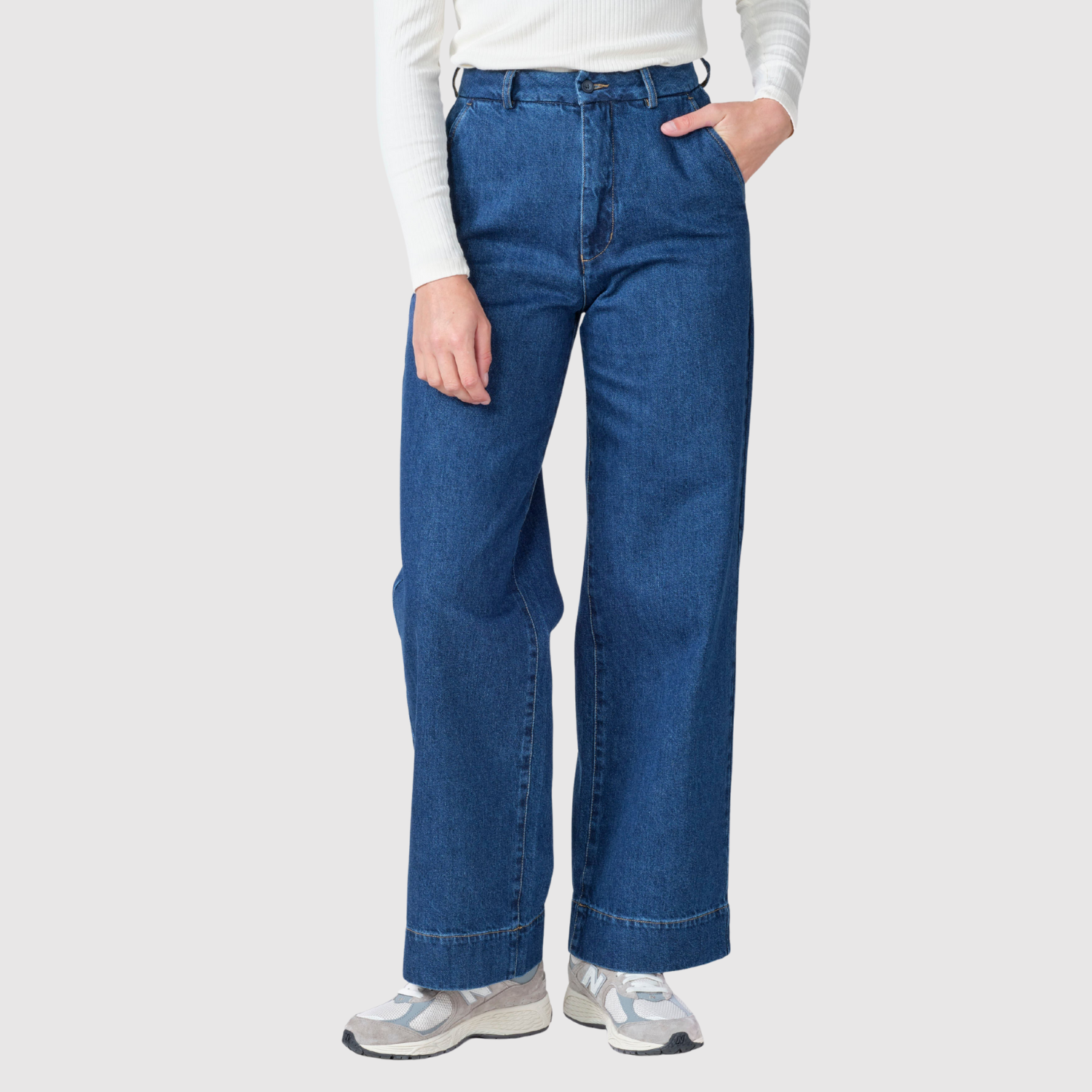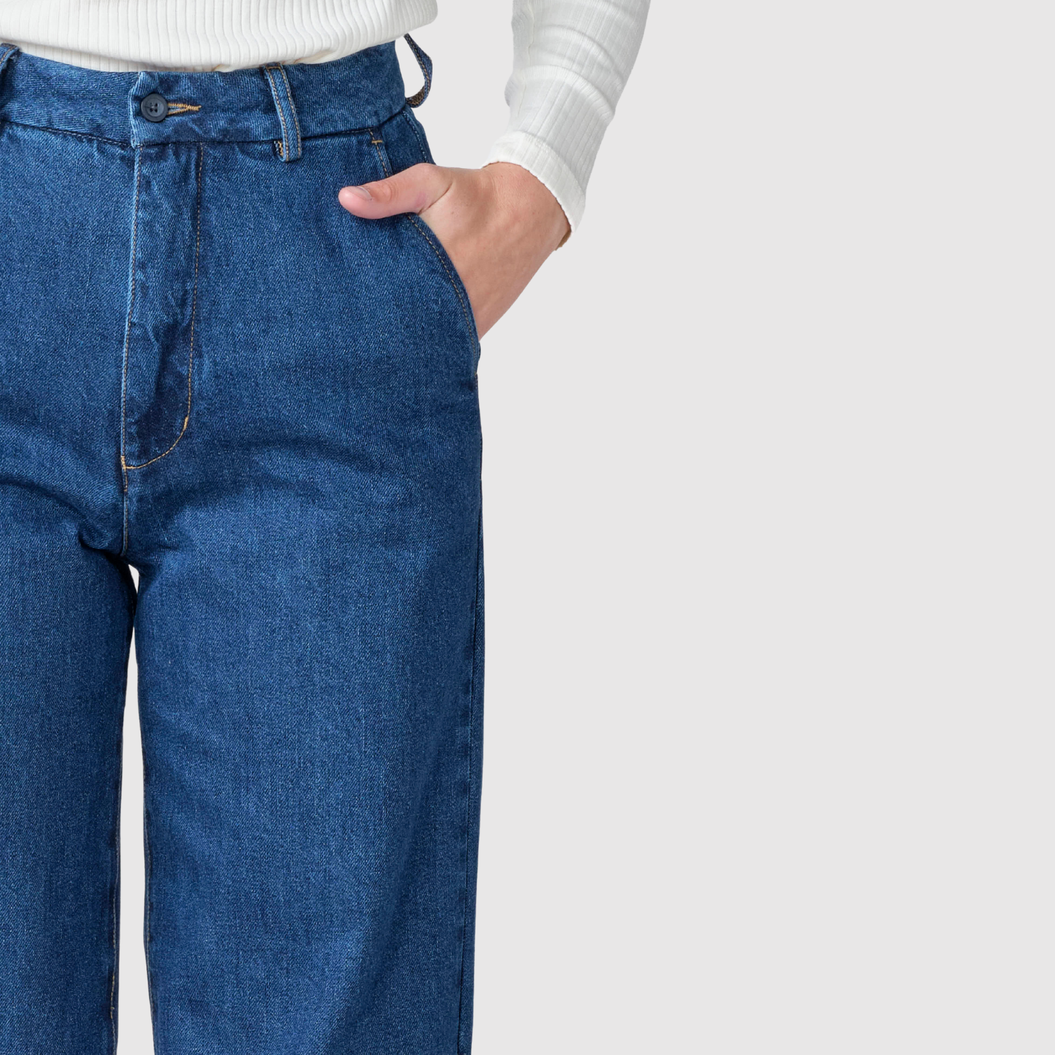 Тези дънкови панталони с висока талия в тъмен мивка комбинират изискан вид с удобна форма. Дълбокият син нюанс придава вечен вид, идеален за ден и вечер. Създадени за комфорт, без да се правят компромиси с стила.