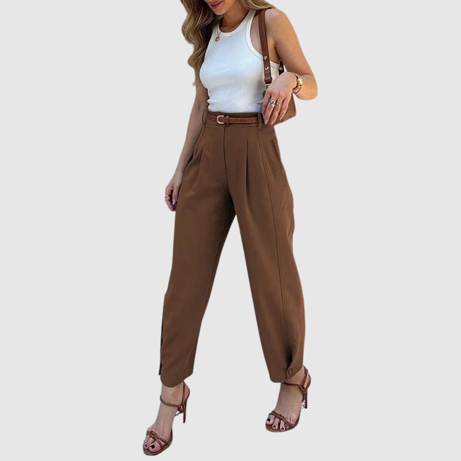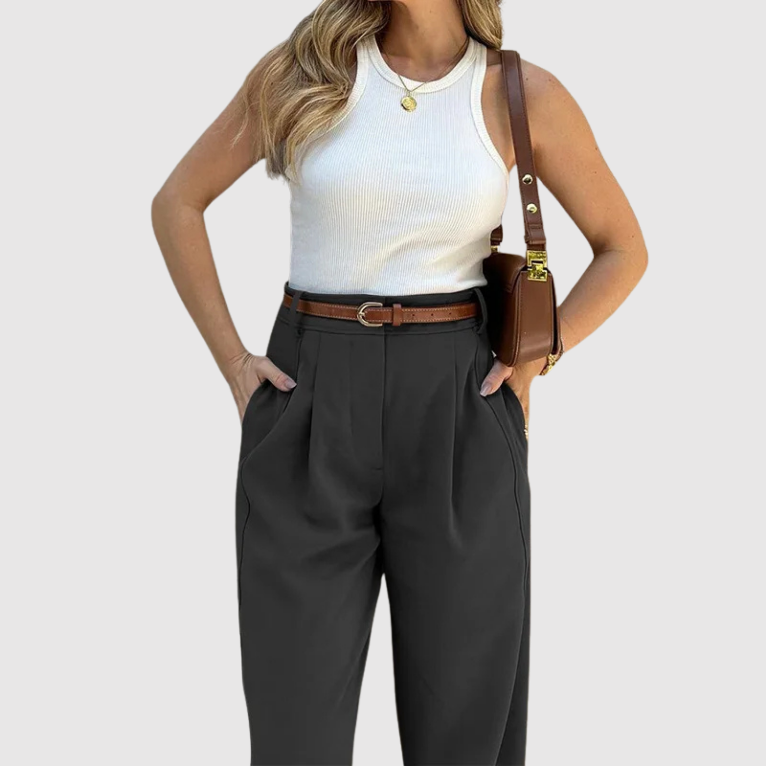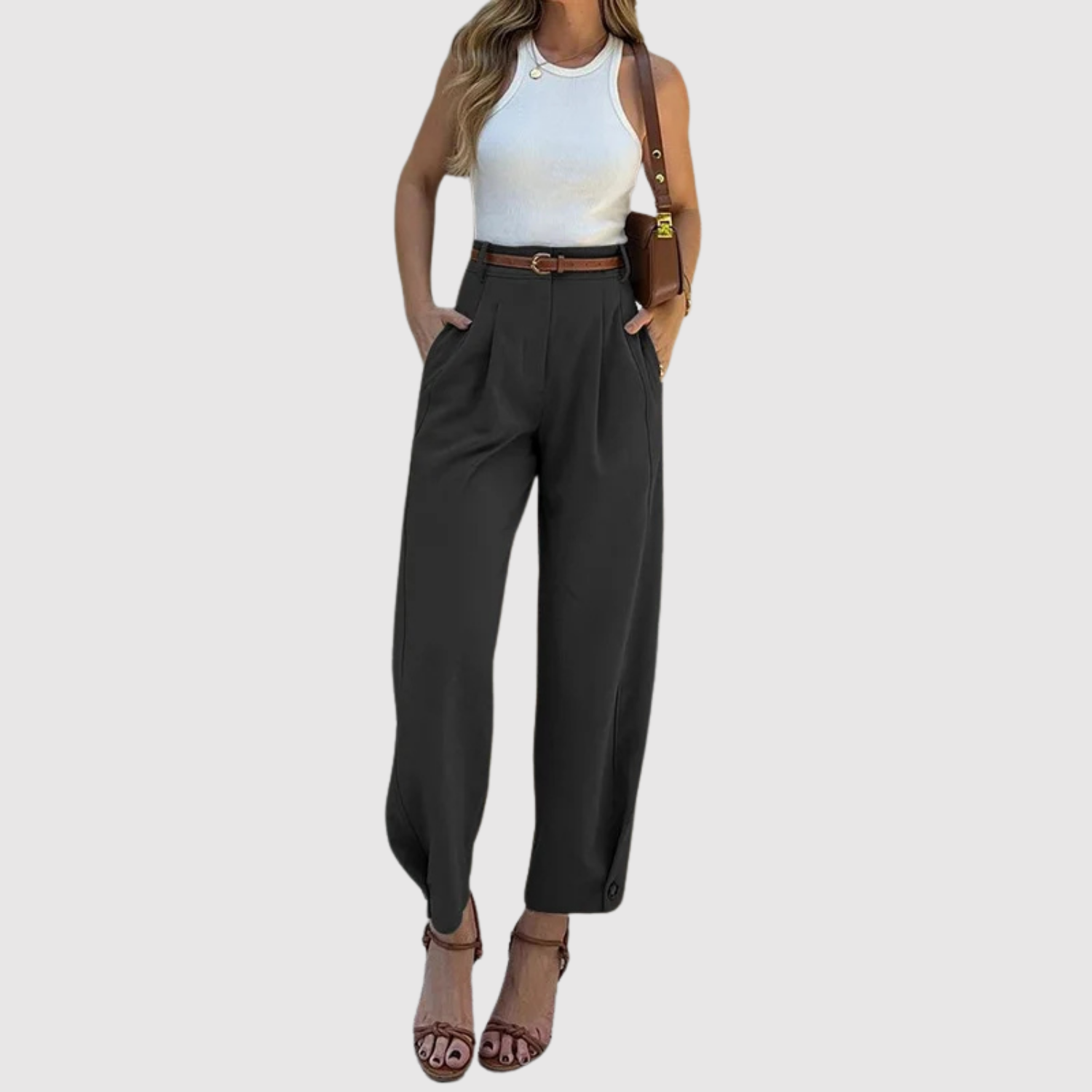 Тези панталони съчетават минималистичен вид с релаксиран силует. Те са удобни за ежедневно носене и лесни за стилизиране с различни аутфити.