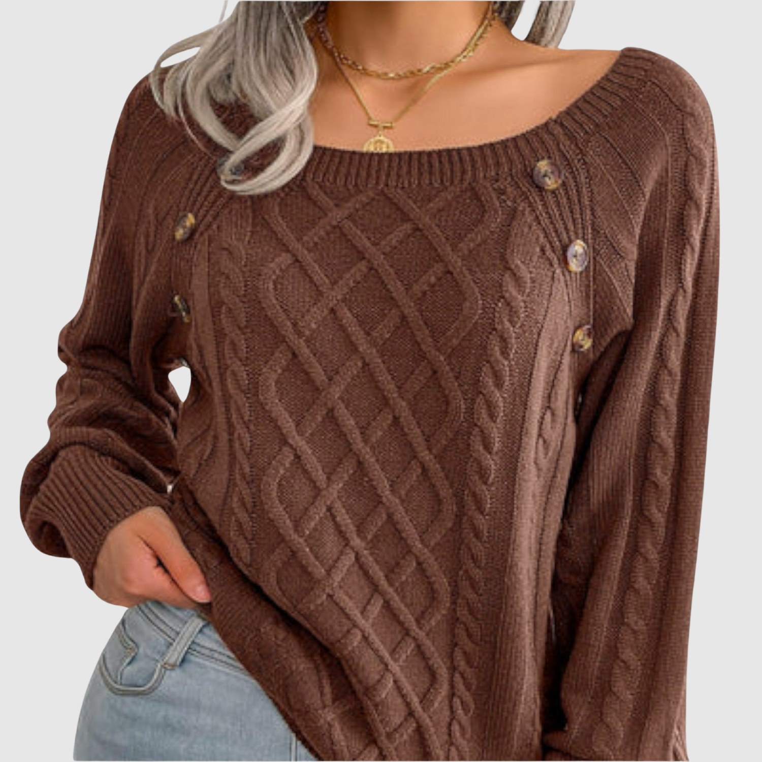 Този пуловер комбинира класическо кабелно плетиво с модерни детайли под формата на декоративни копчета на рамото. Мекото материало осигурява висока комфорт, докато дизайнът го прави едновременно вечен и елегантен.