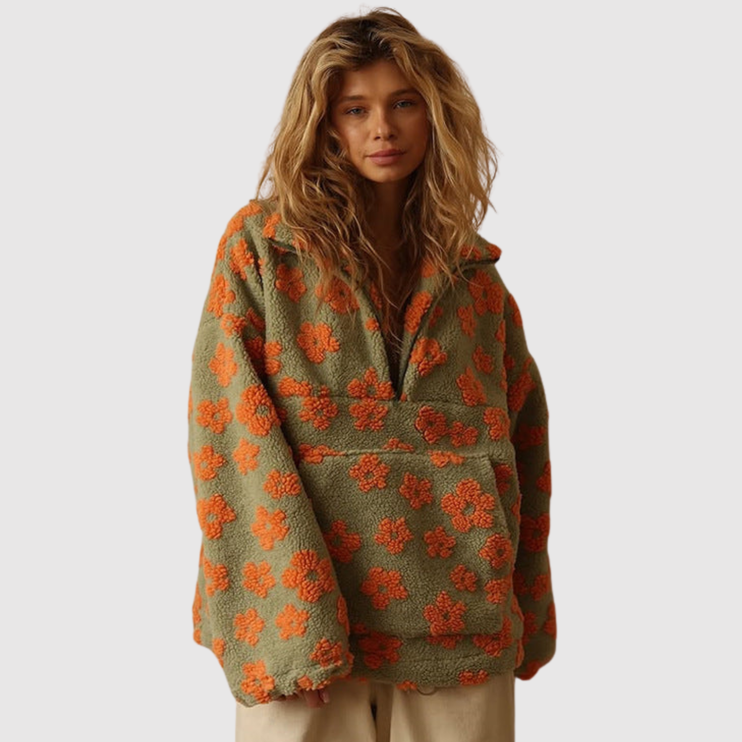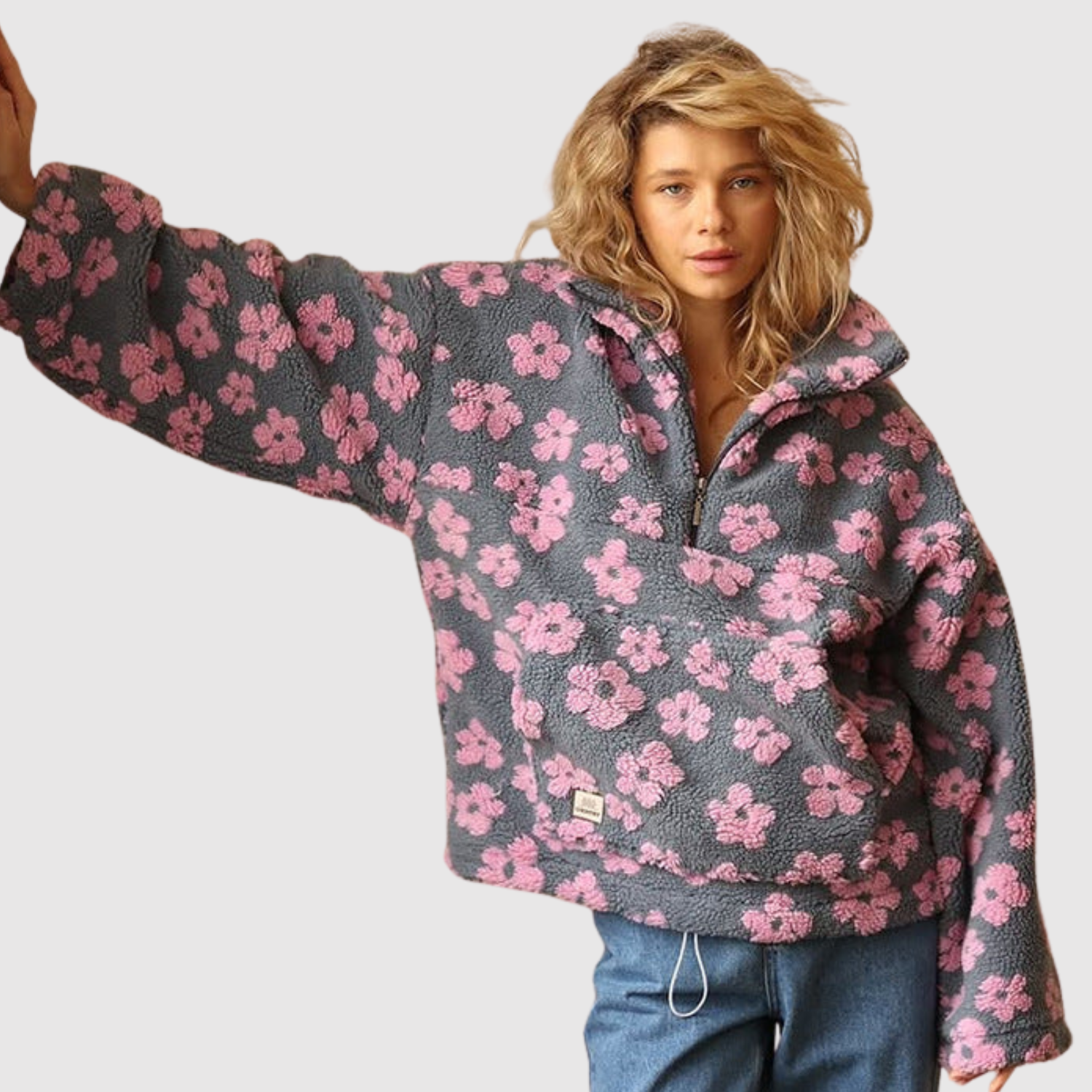 Този флийс комбинира меко материал с игрив цветен принт, който придава свеж и женствен вид. Свободната кройка и полуципът го правят идеален за ежедневна употреба, както вътре, така и навън.
