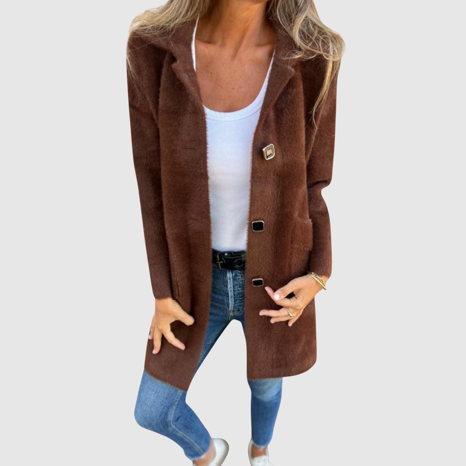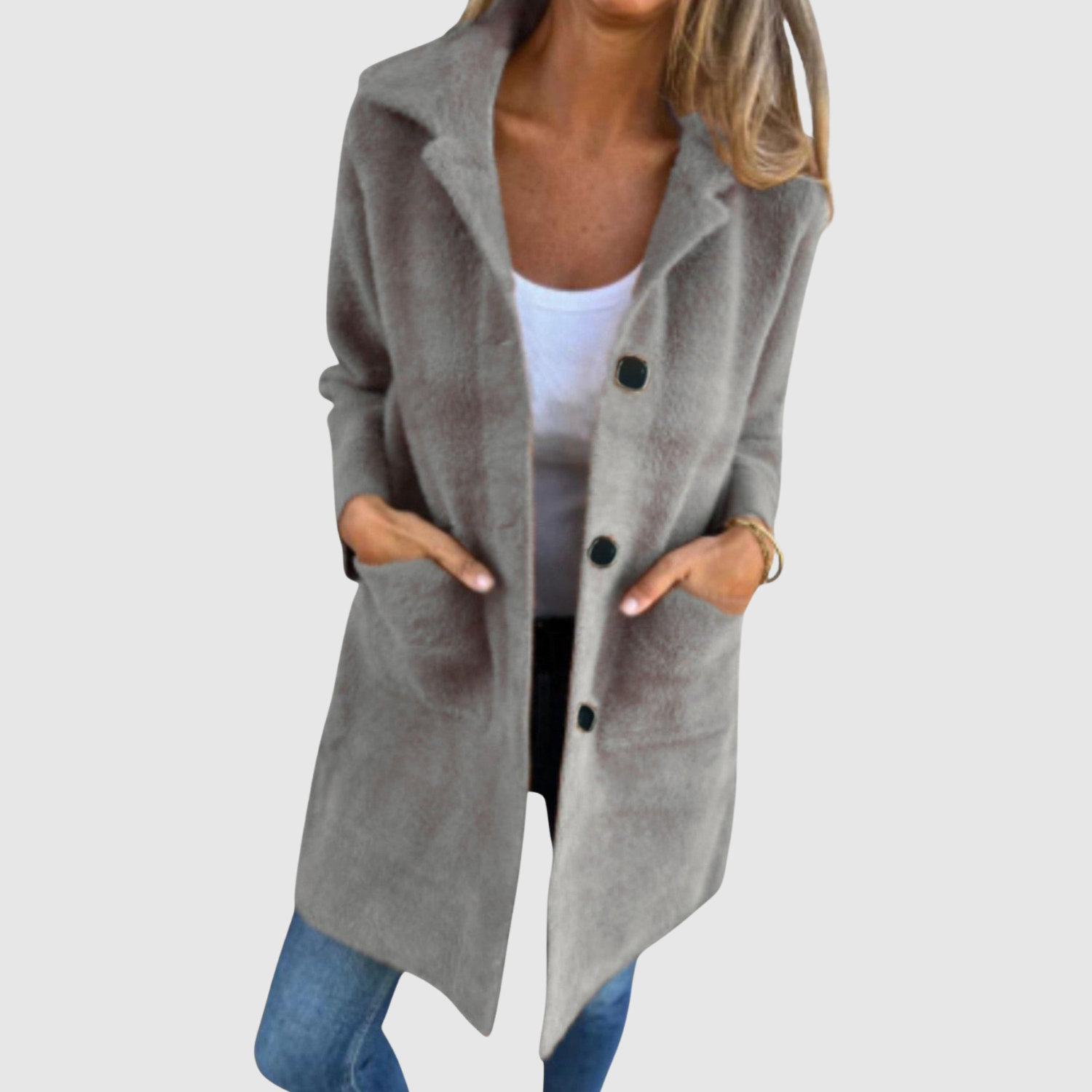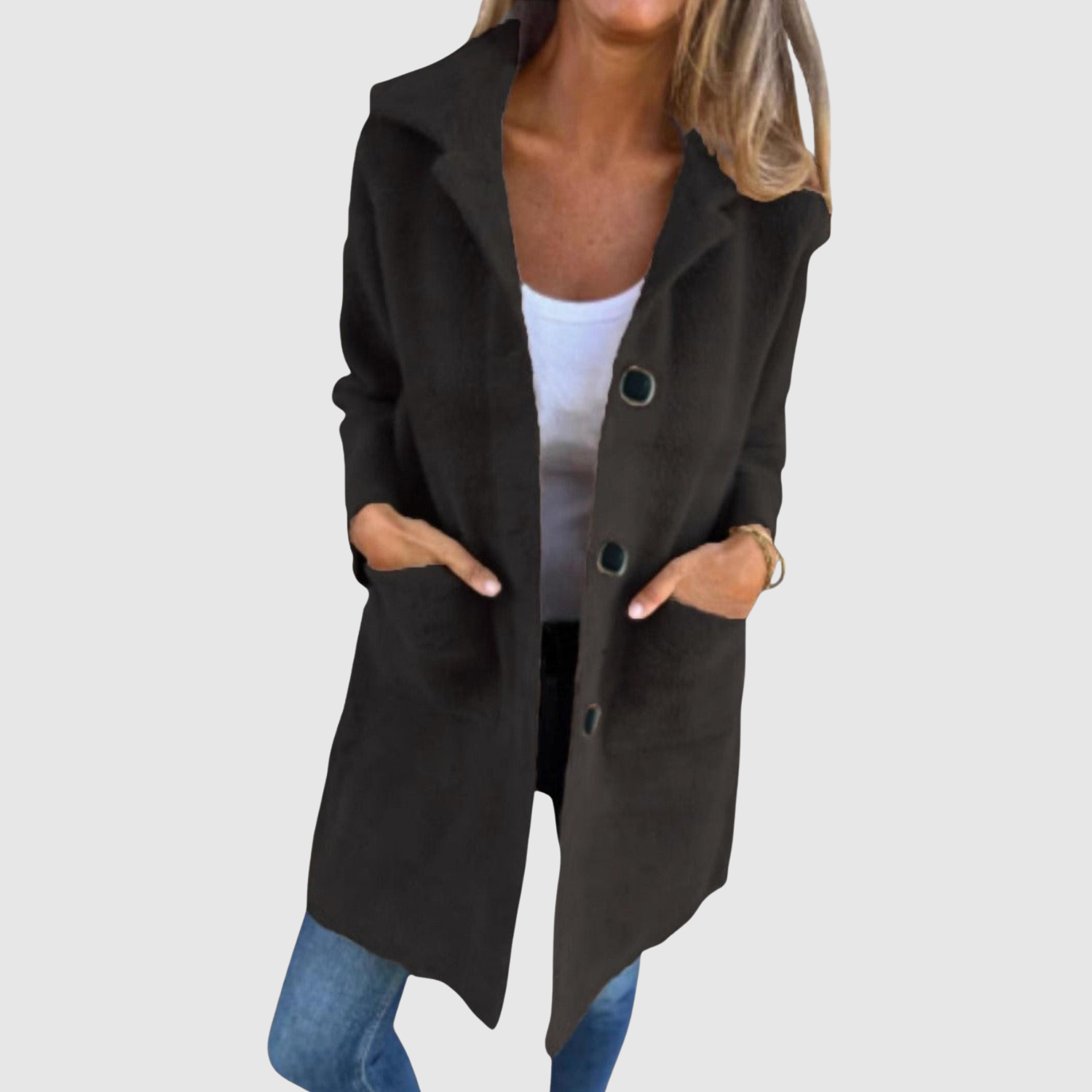 Това дълго палто е елегантен избор за всекидневието. Простият дизайн с копчета и прав силует го прави лесно за комбиниране с различни аутфити. Идеално за преходни периоди, когато искате комфорт, без да правите компромис със стила.