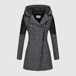 Това дълго яке комбинира модерен дизайн с практични детайли. Асиметричният цип и фигуралният силует придават модерен вид, докато подплатеният материал и качулката осигуряват топлина и комфорт в студено време.