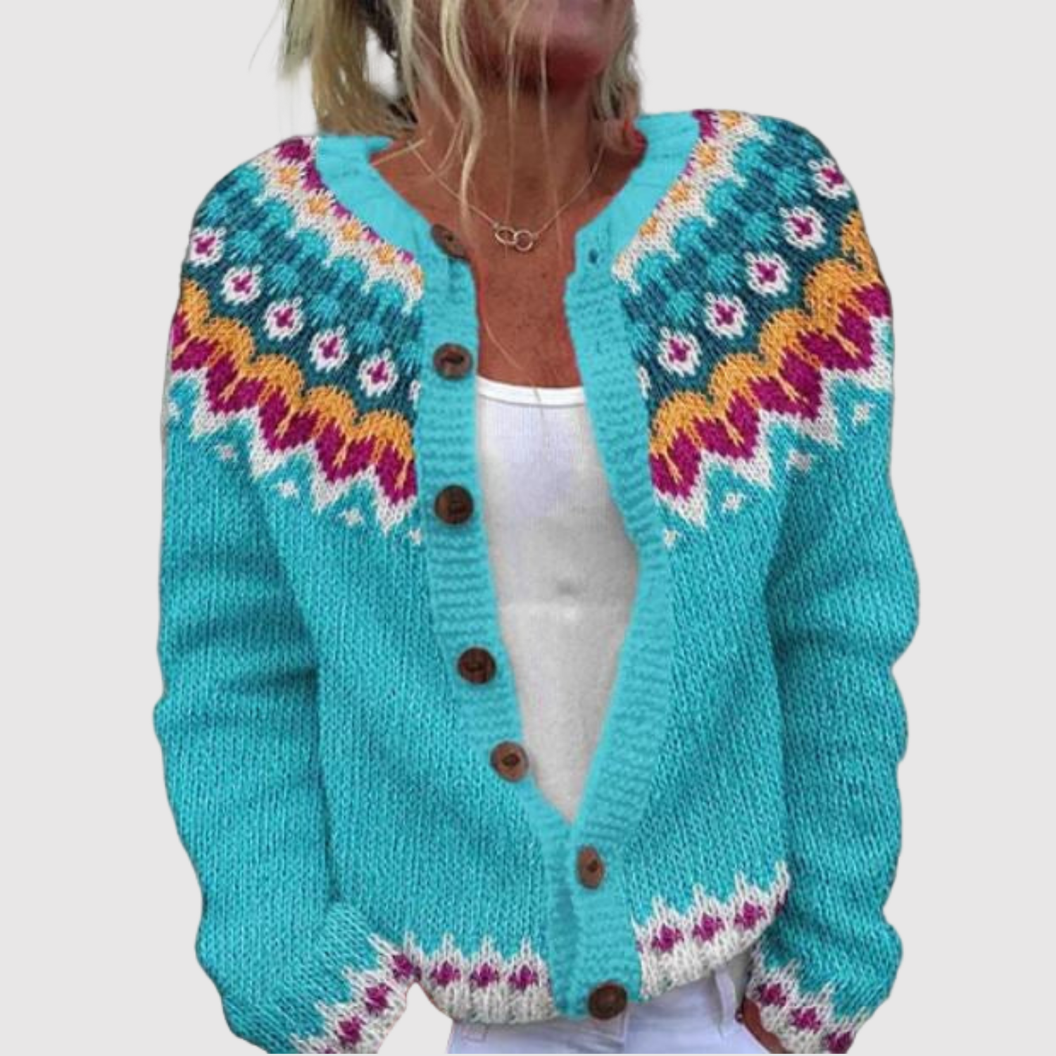Уютен кардиган с красиво северноизточно вдъхновен мотив. Перфектен за топлина и стил в хладни дни. Мекото плетиво и ярките цветове го правят привлекателен акцент в гардероба.
