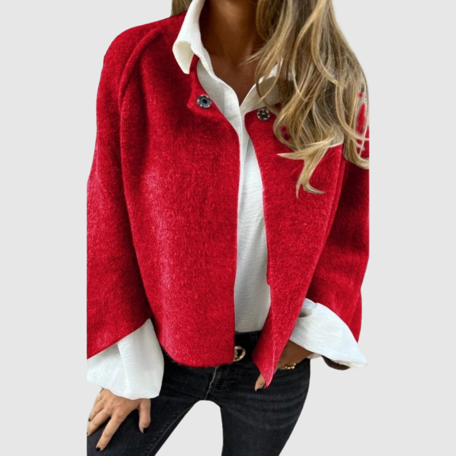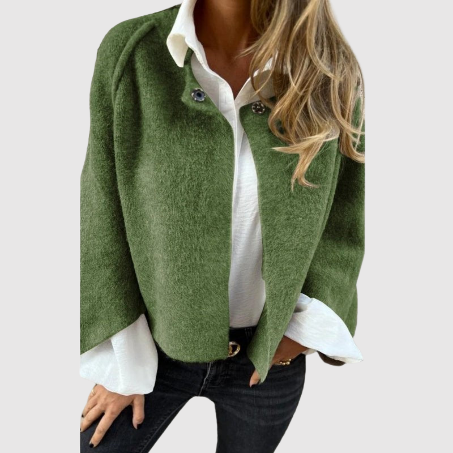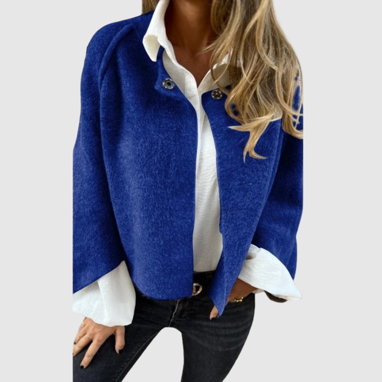 Това късо яке съчетава комфорт и стил с мекото си материя и модерен силует. Перфектно за преходни сезони, когато искате небрежен, но елегантен вид. С простия си дизайн е лесно за комбиниране както с дънки, така и с по-класически аутфити.