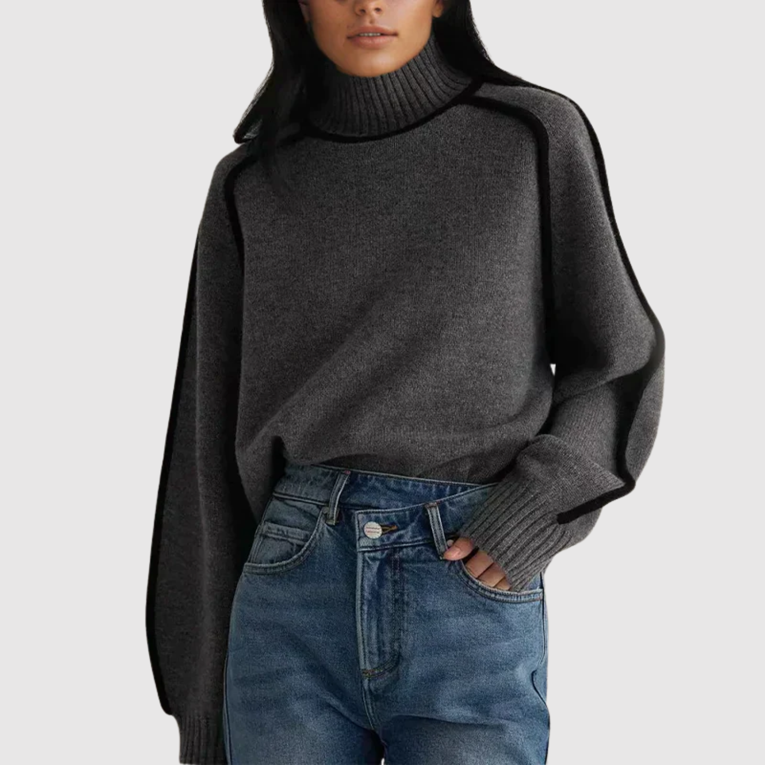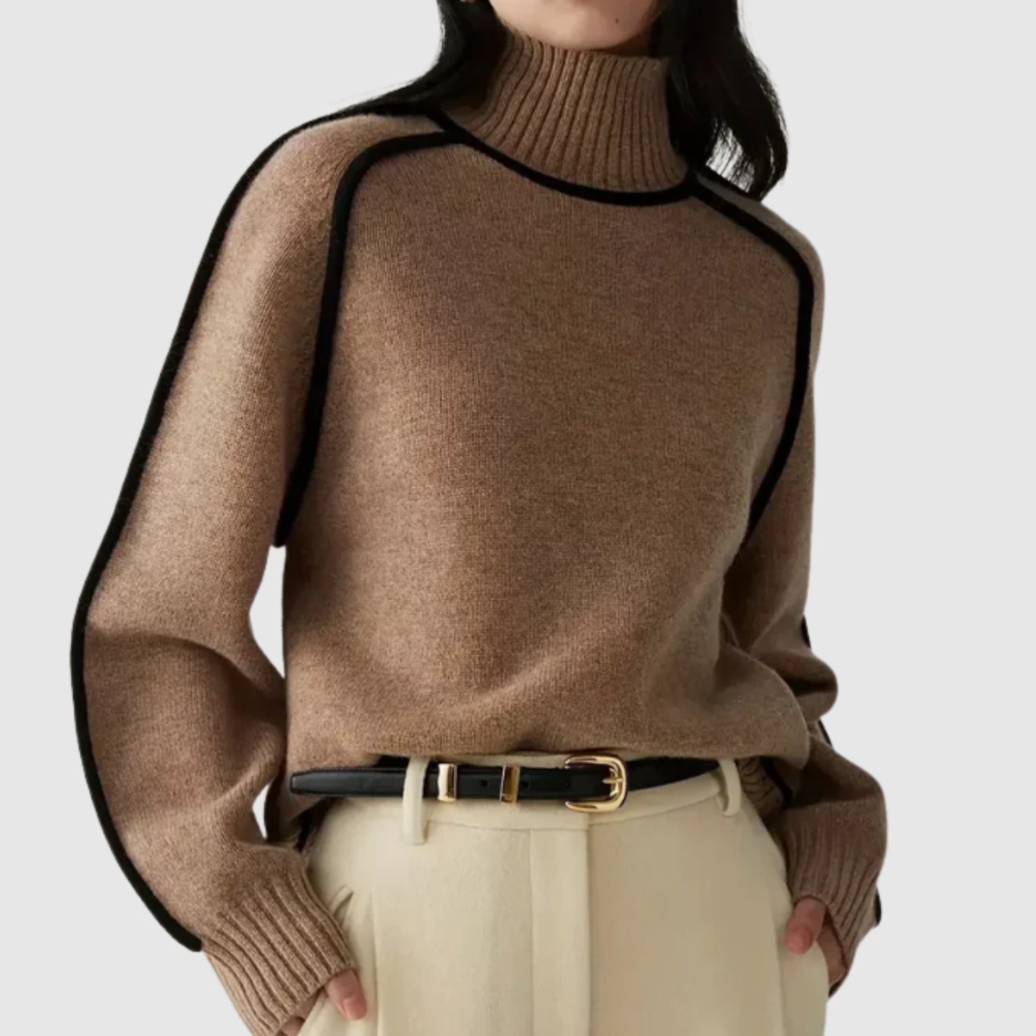 Този изтънчен пуловер впечатлява с минималистичен дизайн и стилни контрастни кантове. Изработен от мека, плътна материя, той осигурява топлина и комфорт през студените дни. Идеален избор за градски елегантен стил или ежедневна визия с класа.