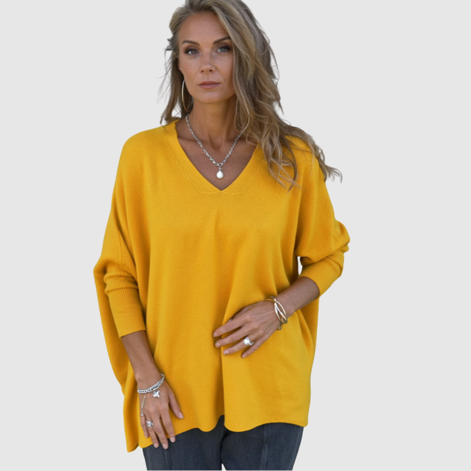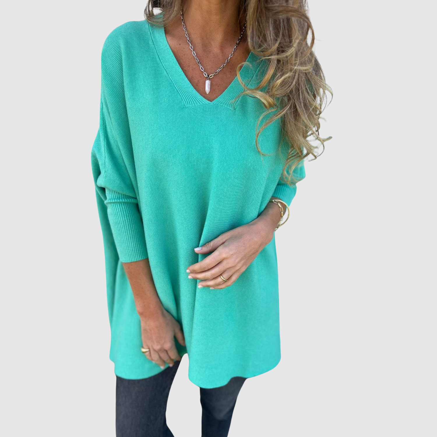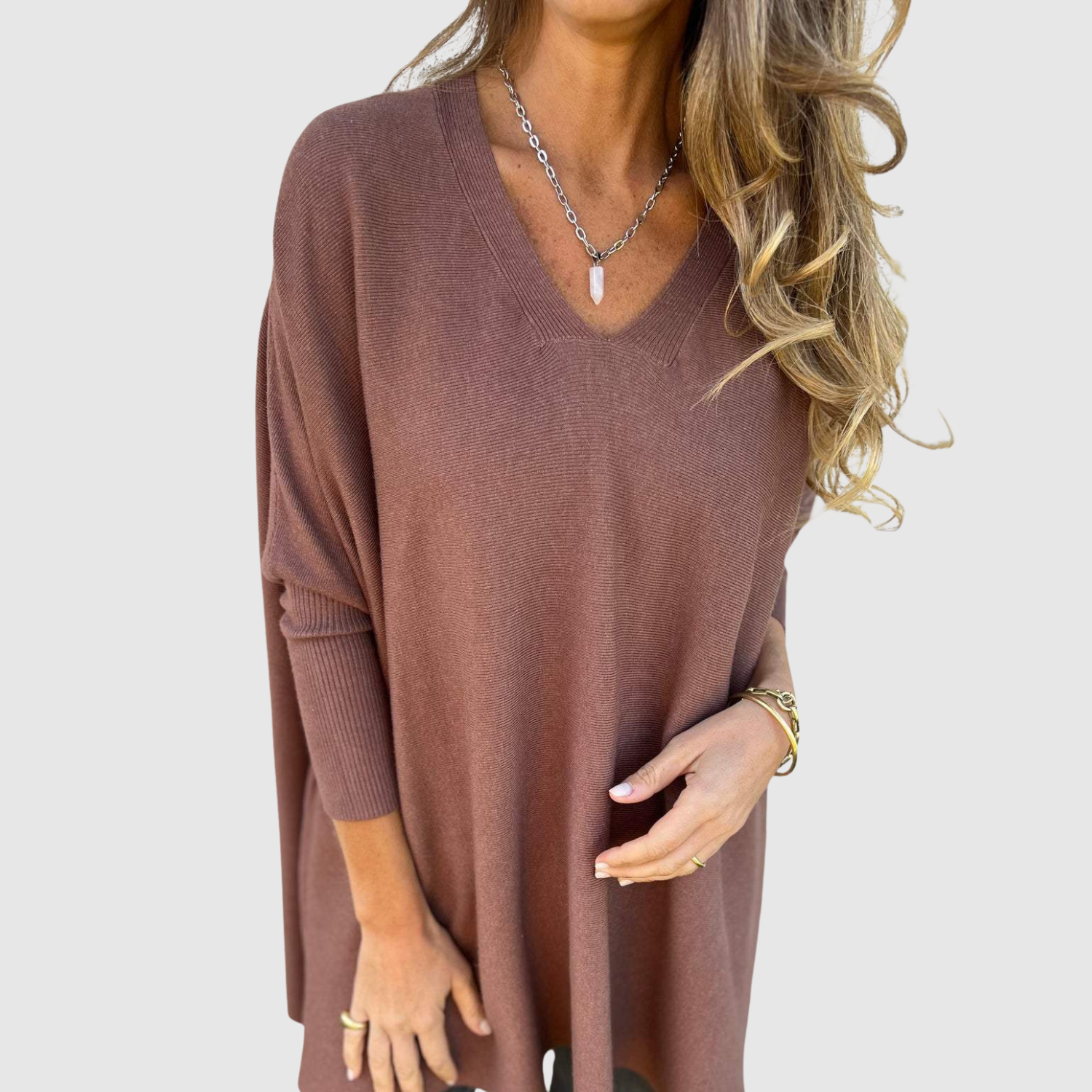 Този пуловер с мек допир и свободна кройка е идеален за есенно-зимния сезон. V-образното деколте придава изтънченост, а еластичната материя осигурява свобода на движението и удобство през целия ден.
