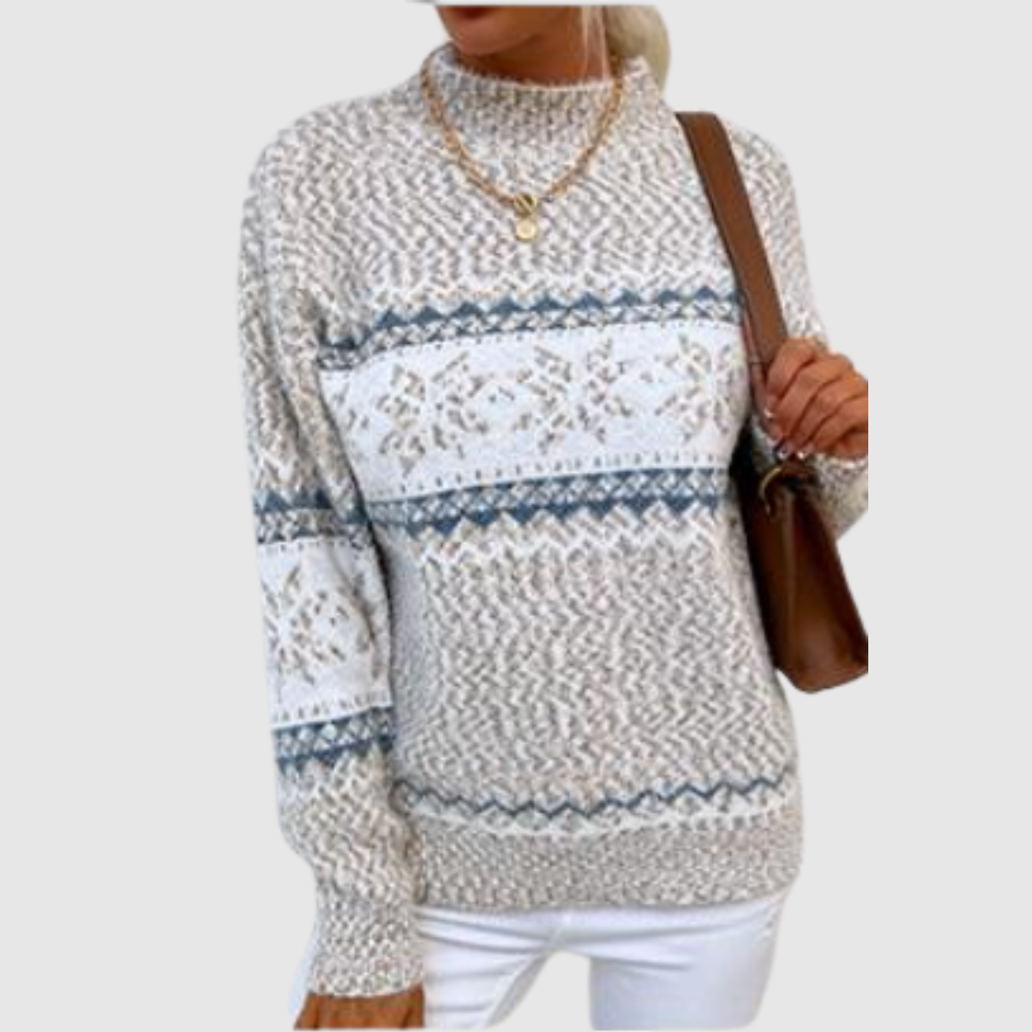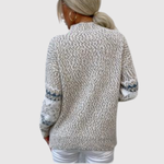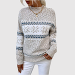 Този красив пуловер в неутрални цветове съчетава скандинавски стил с модерен комфорт. Деликатният принт в бяло и синьо придава свежо излъчване, а меката плетка осигурява топлина през студените дни. Идеален както за ежедневието, така и за зимни почивки.