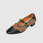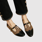 Този изискан модел комбинира ретро естетика и ежедневна практичност. Изработени от висококачествена еко кожа и текстурирана материя, обувките впечатляват с T-образна каишка и златиста катарама. Мекият вътрешен слой и стабилният нисък ток осигуряват лекота и комфорт при всяка стъпка.