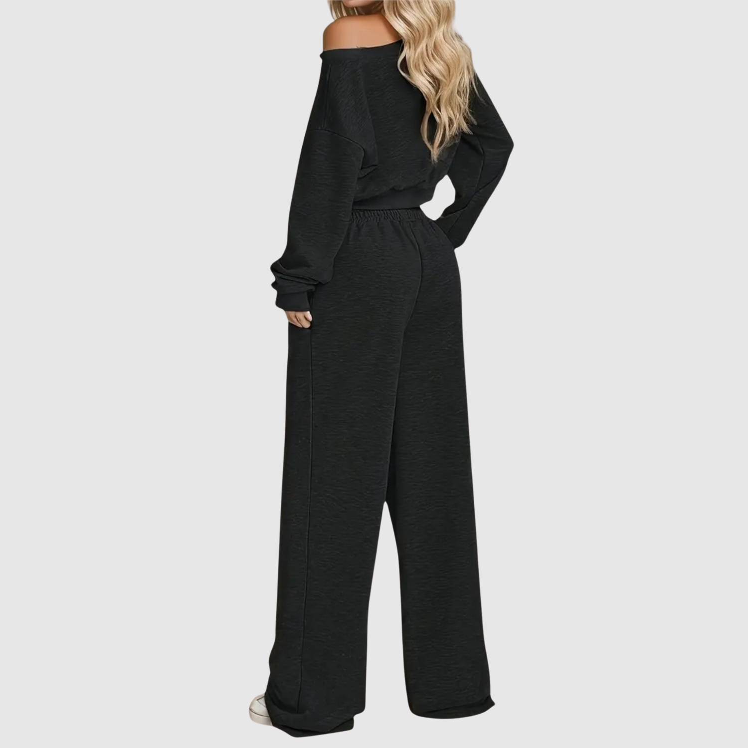 Модерен двусъставен комплект с горна част с открити рамене и широки панталони, създаден да комбинира неформален стил с изискана елегантност. Материята е лека и приятна, което прави комплекта идеален както за ежедневието, така и за вечерни поводи.