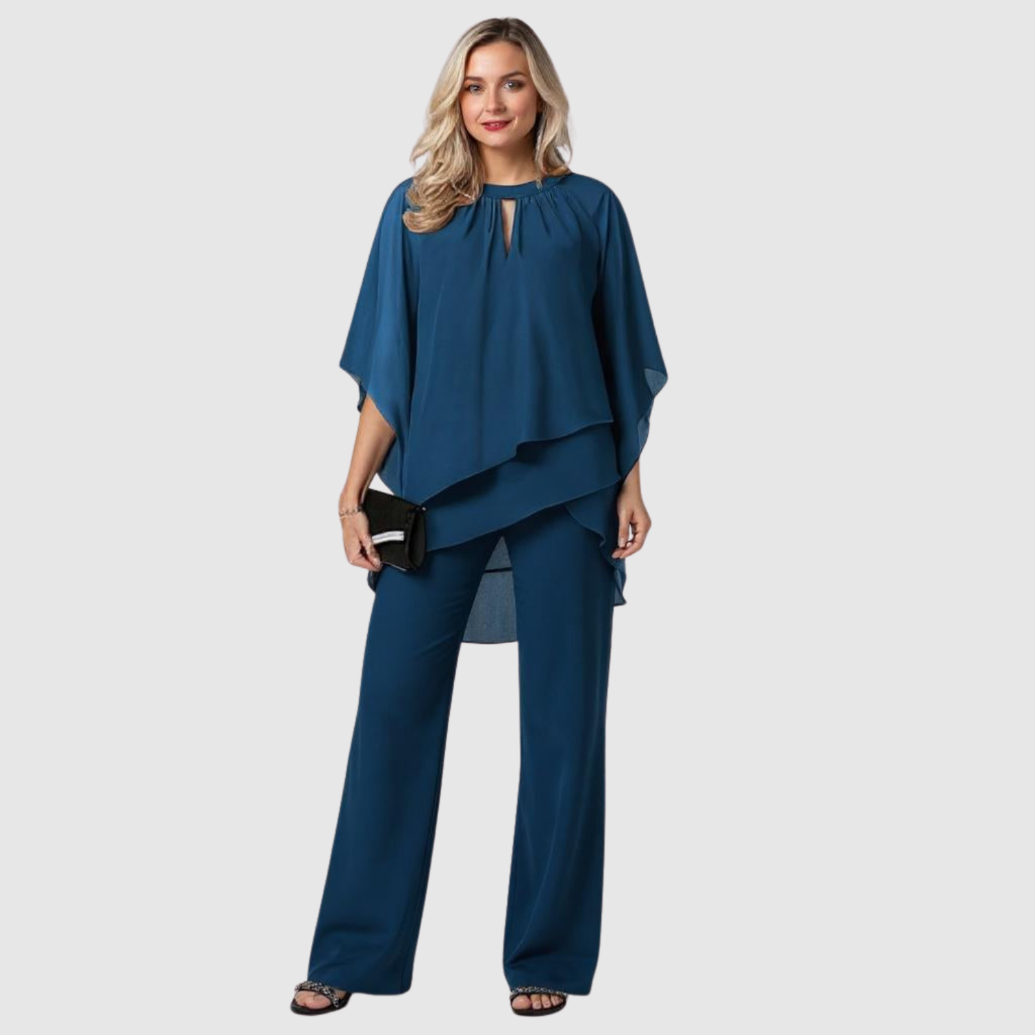 Този елегантен комплект се състои от свободен топ с асиметричен пад и съответстващи панталони. Дизайнът придава изискан вид, докато въздушната кройка осигурява максимален комфорт през целия ден. Перфектен както за офис, вечери, така и за празнични поводи.
