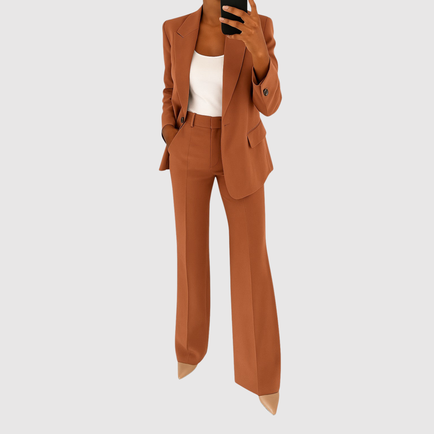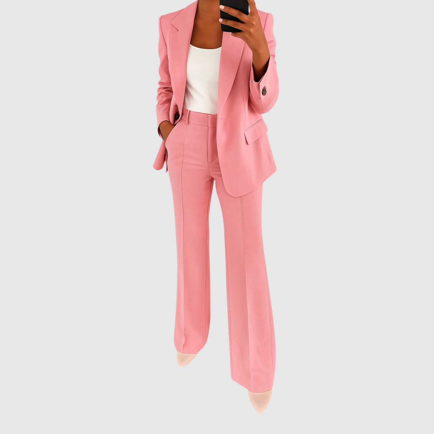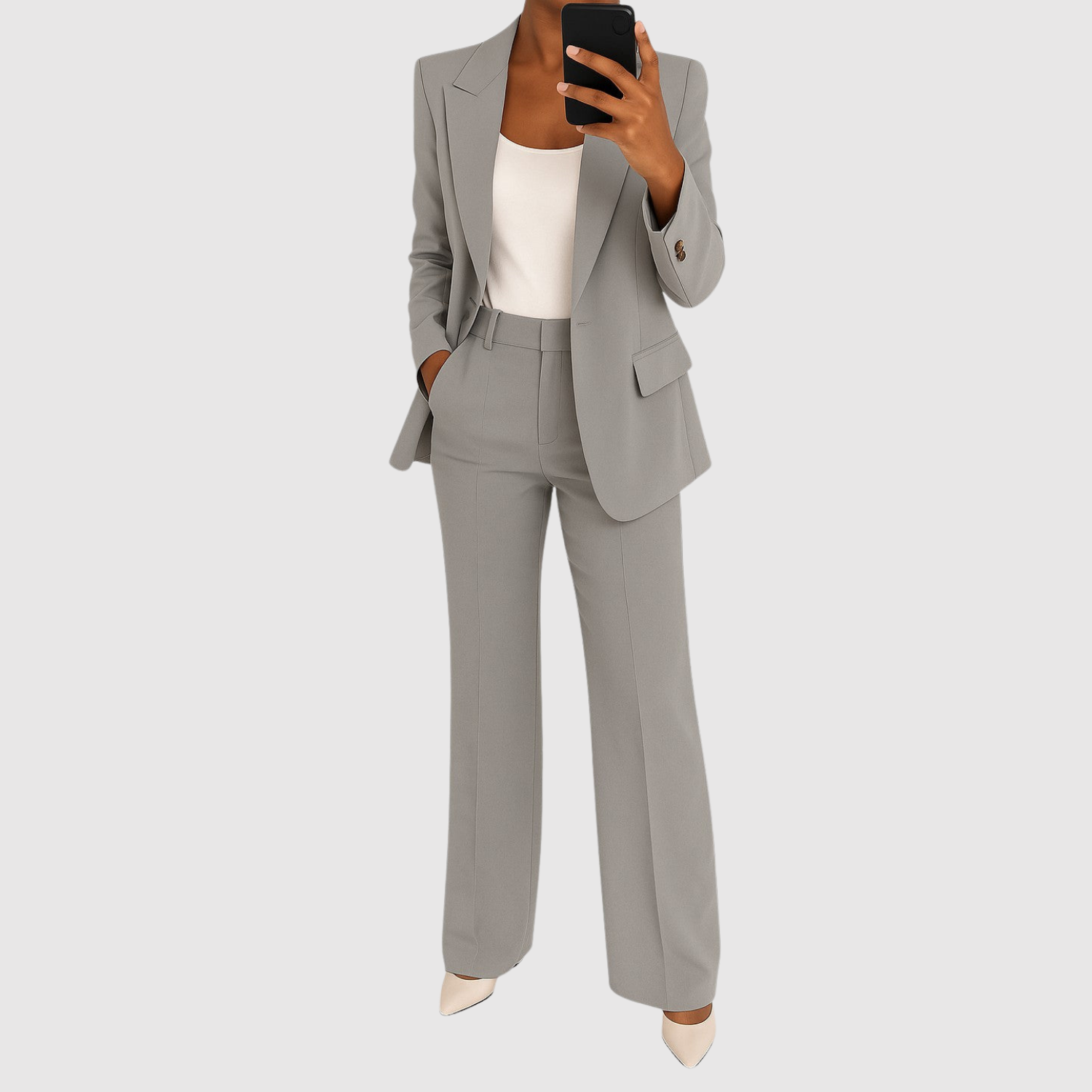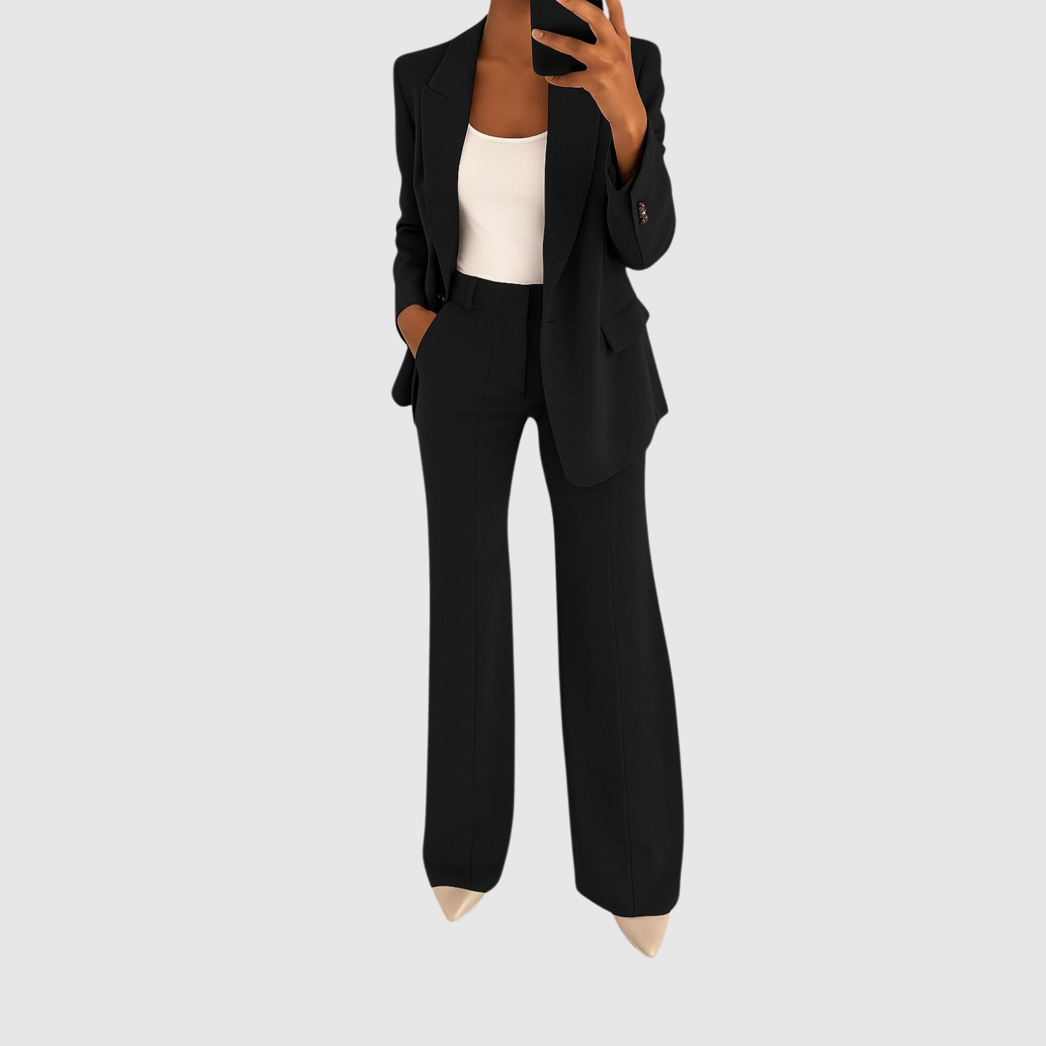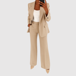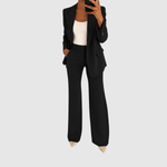 Този гащеризон комбинира класическо шивачество с актуален силует. Той има елегантен блейзър вид с подходящи панталони, които могат да се носят както на работа, така и на празнични поводи. Удобният материал осигурява свобода на движение, без да се компрометира изисканото излъчване.