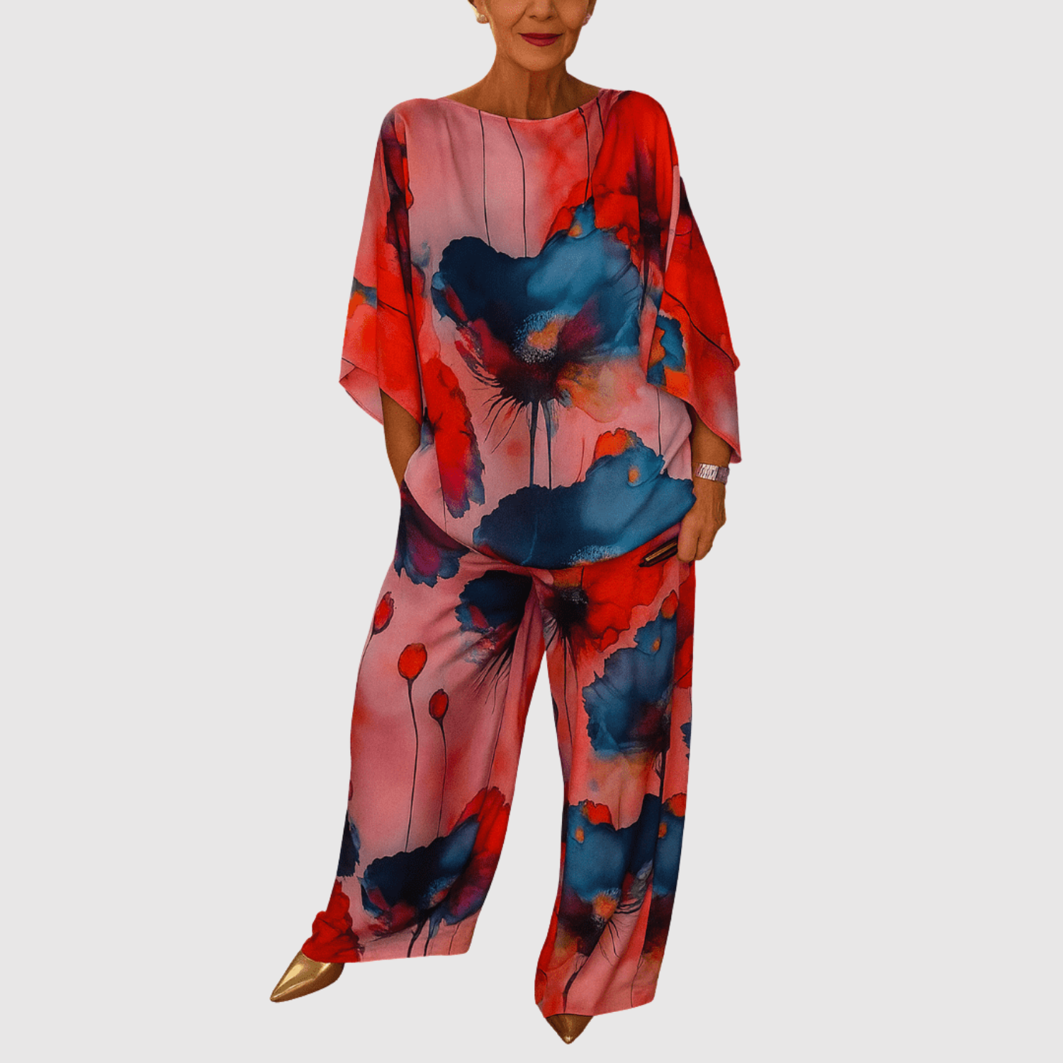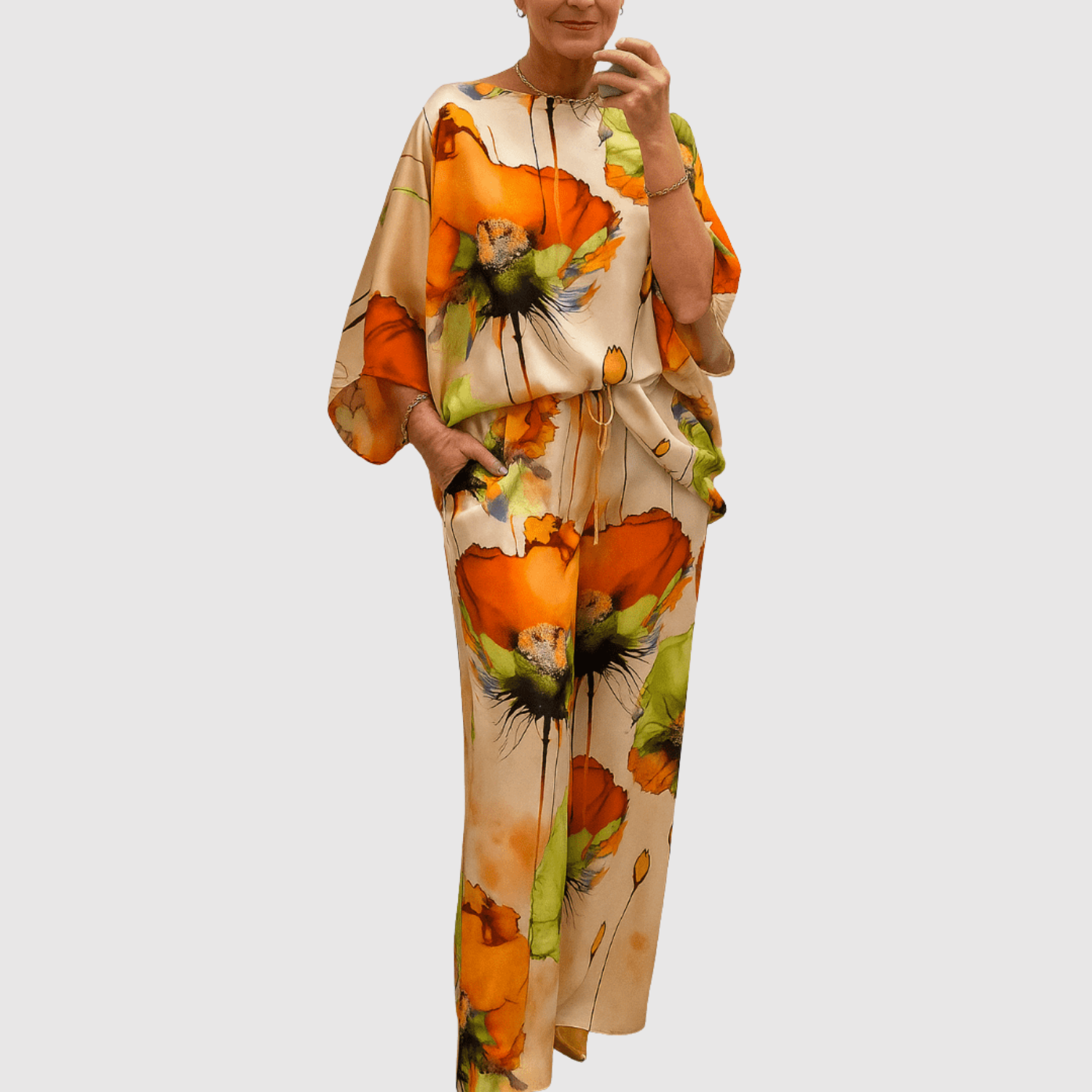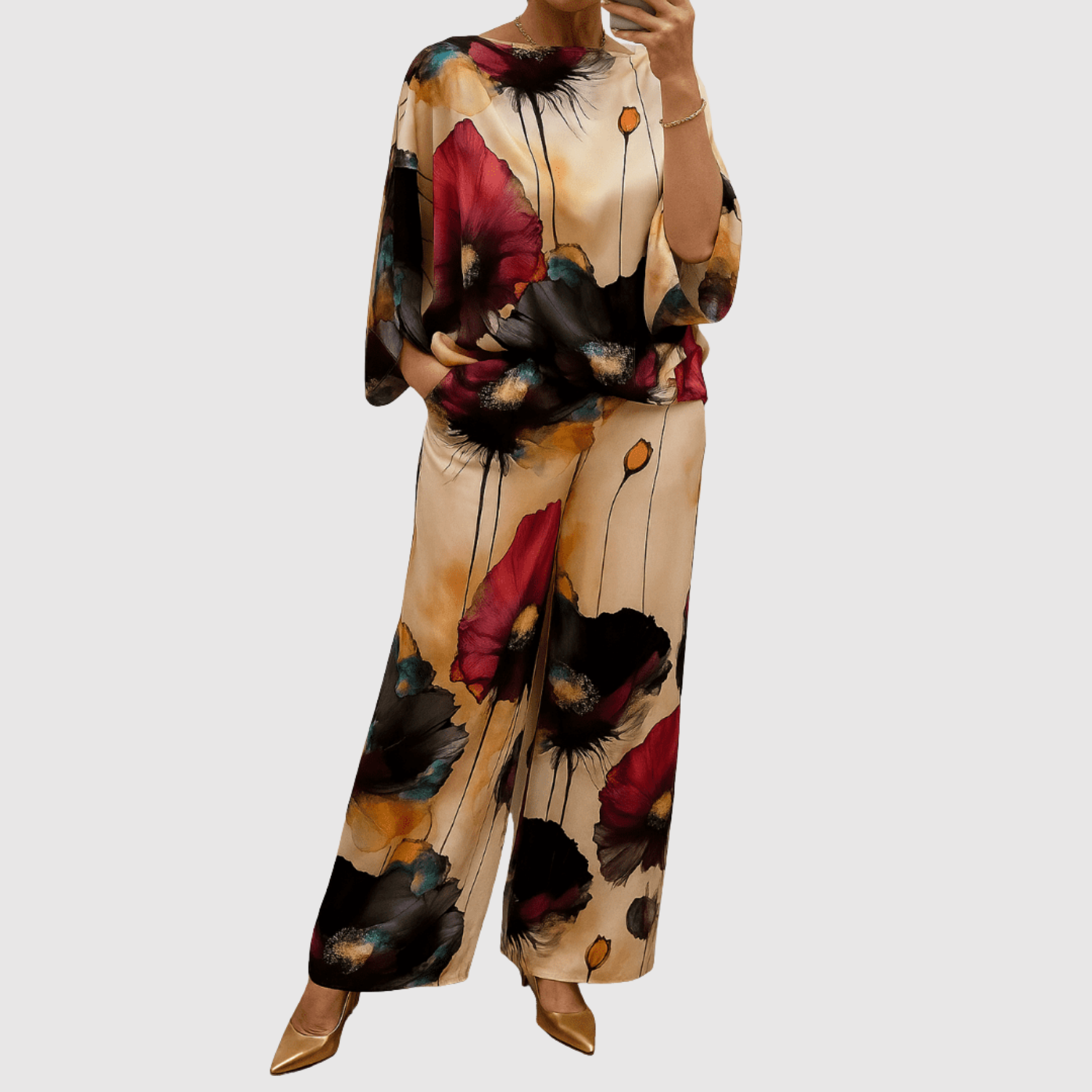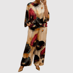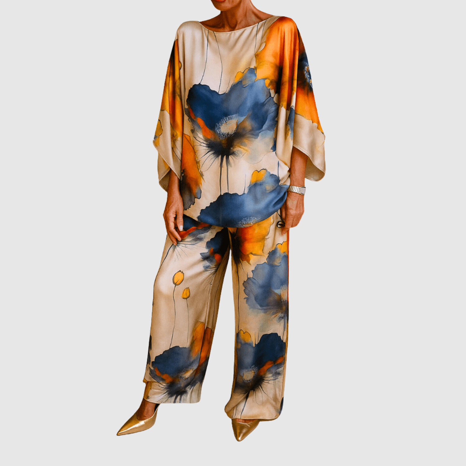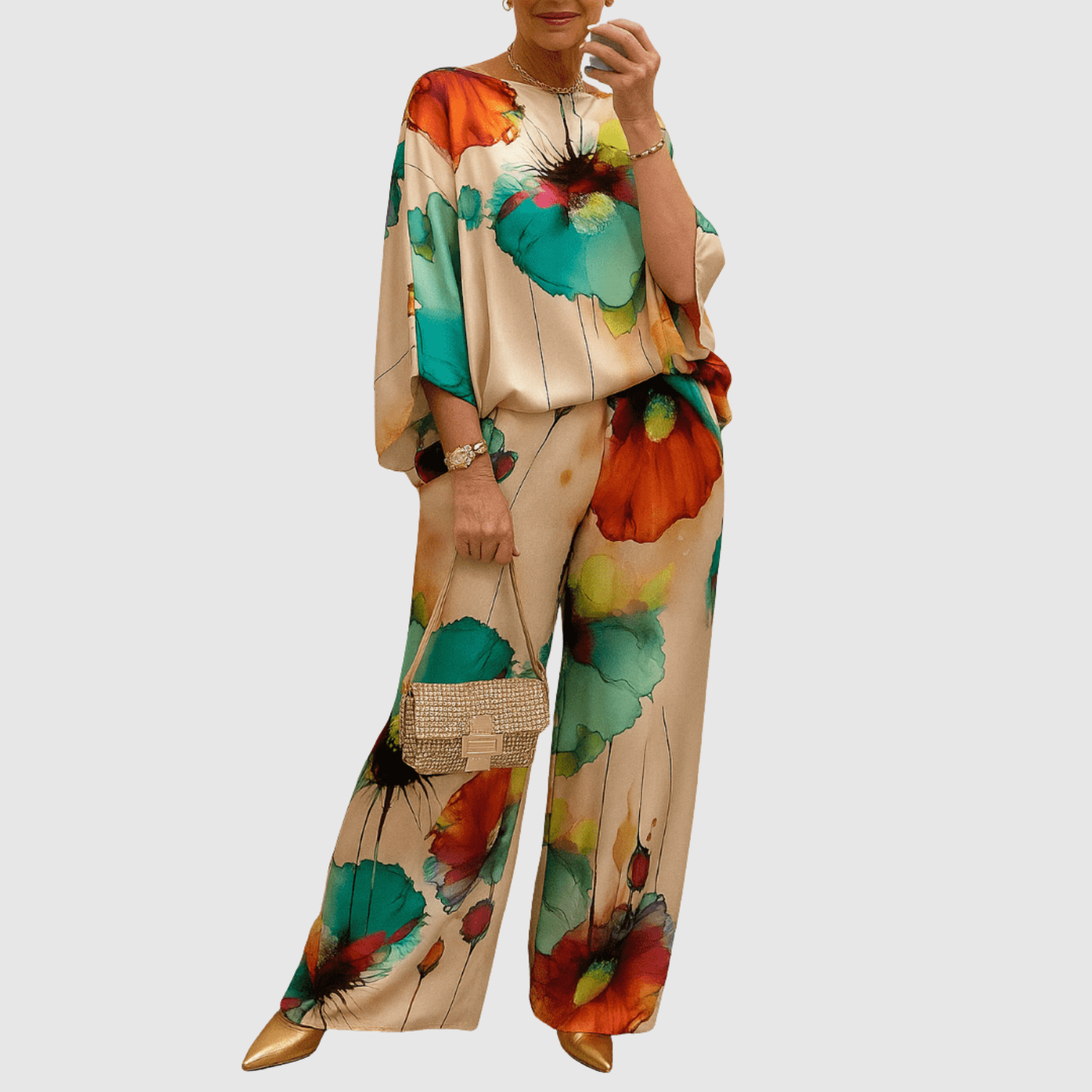 Луксозен комплект от сатен с течащи акварелни принтове в живи цветове. Материята е мека и лъскава, което придава изискан вид, идеален както за специални поводи, така и за ежедневна употреба с стил. С удобна кройка и артистичен дизайн, този комплект е привлекателен.