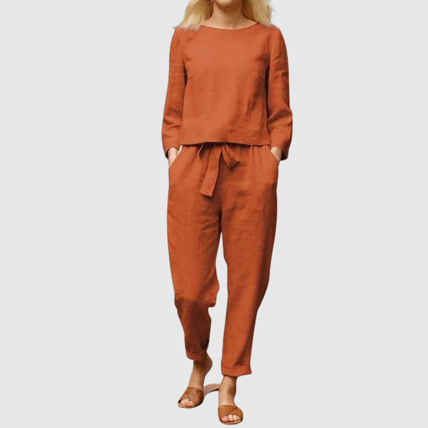 Вечен комплект, състоящ се от дълги панталони и съвпадаща блуза с удобен силует. Идеален за работа, свободно време и пътувания, когато искате баланс между комфорт и елегантност. Материята е лека и дишаща, перфектна за всички сезони.