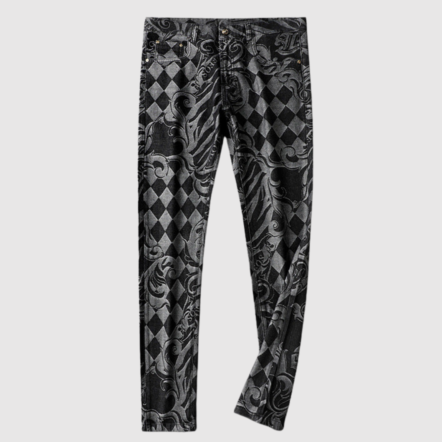 Тези дънки комбинират барокови извивки с харлекин вдъхновени диаманти за смело и вечно излъчване. Детайли като шарен патч и метален емблема завършват дизайна и подчертават ексклузивния характер.