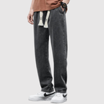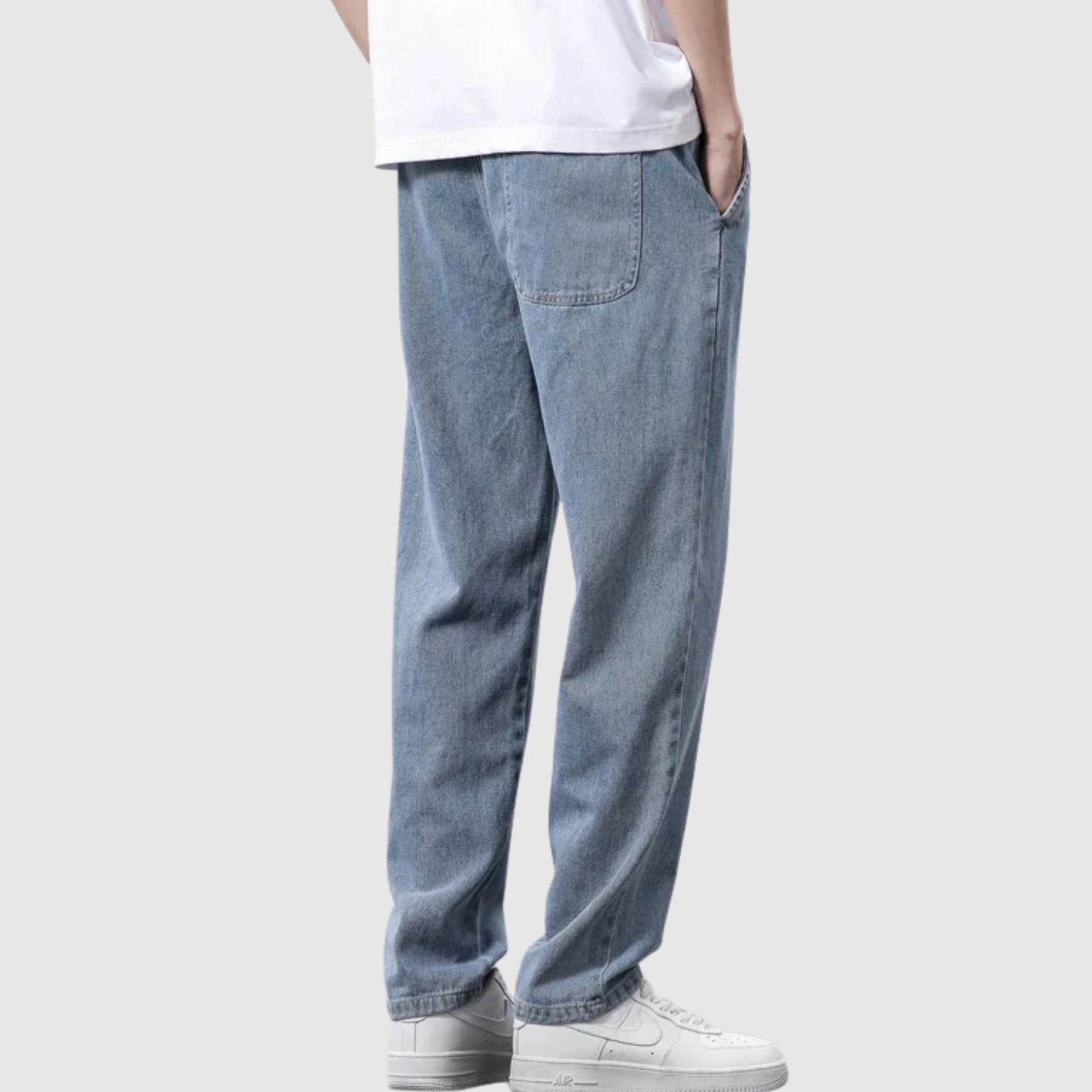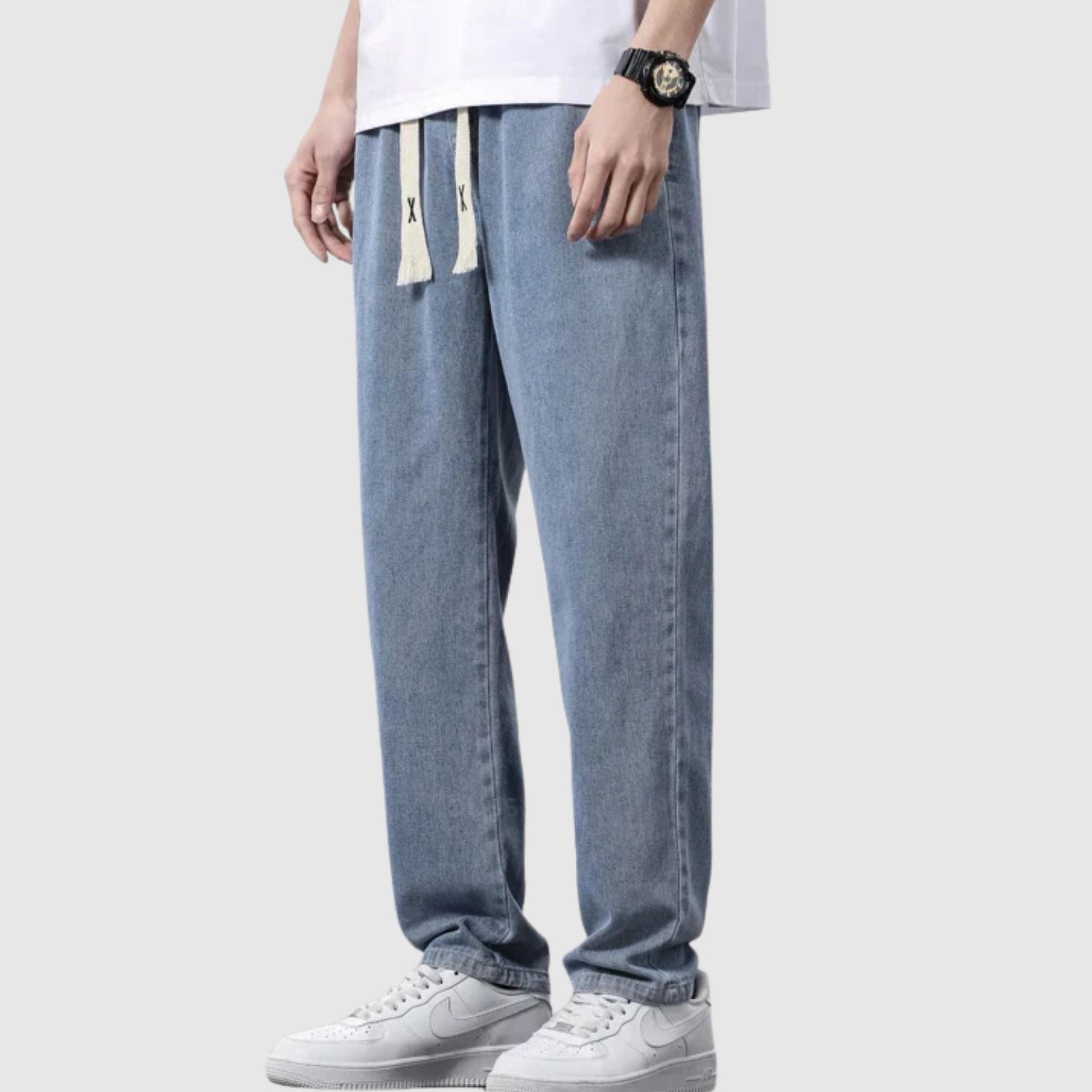 Тези лесни за пране дънкови панталони комбинират уличен стил с комфортна кройка. Еластичният колан с контрастен шнур придава небрежен вид, идеален за ежедневна употреба и неформални аутфити.