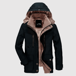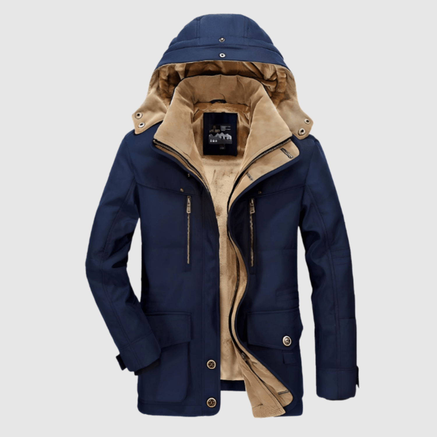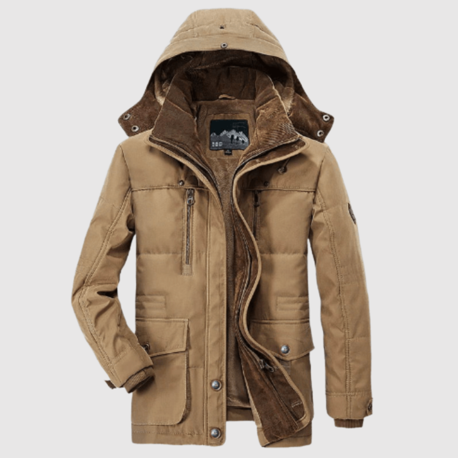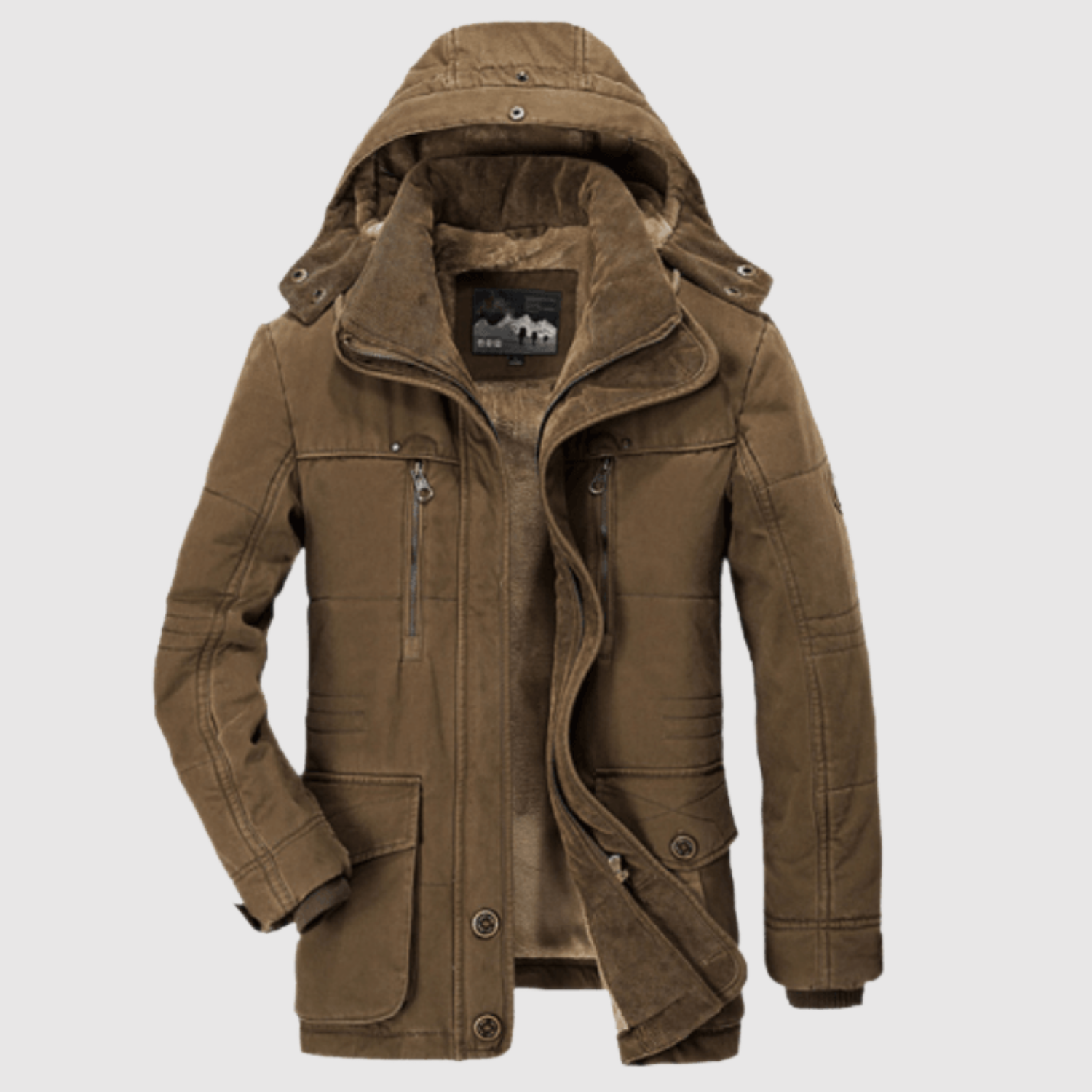 Това зимно палто е създадено да устоява на най-студените дни с материалите си с голяма плътност и мека подплата. Отстраняемата качулка с козина добавя както функционалност, така и стил. Универсален избор за мъже, които търсят надежден комфорт, без да правят компромис с модерния вид.