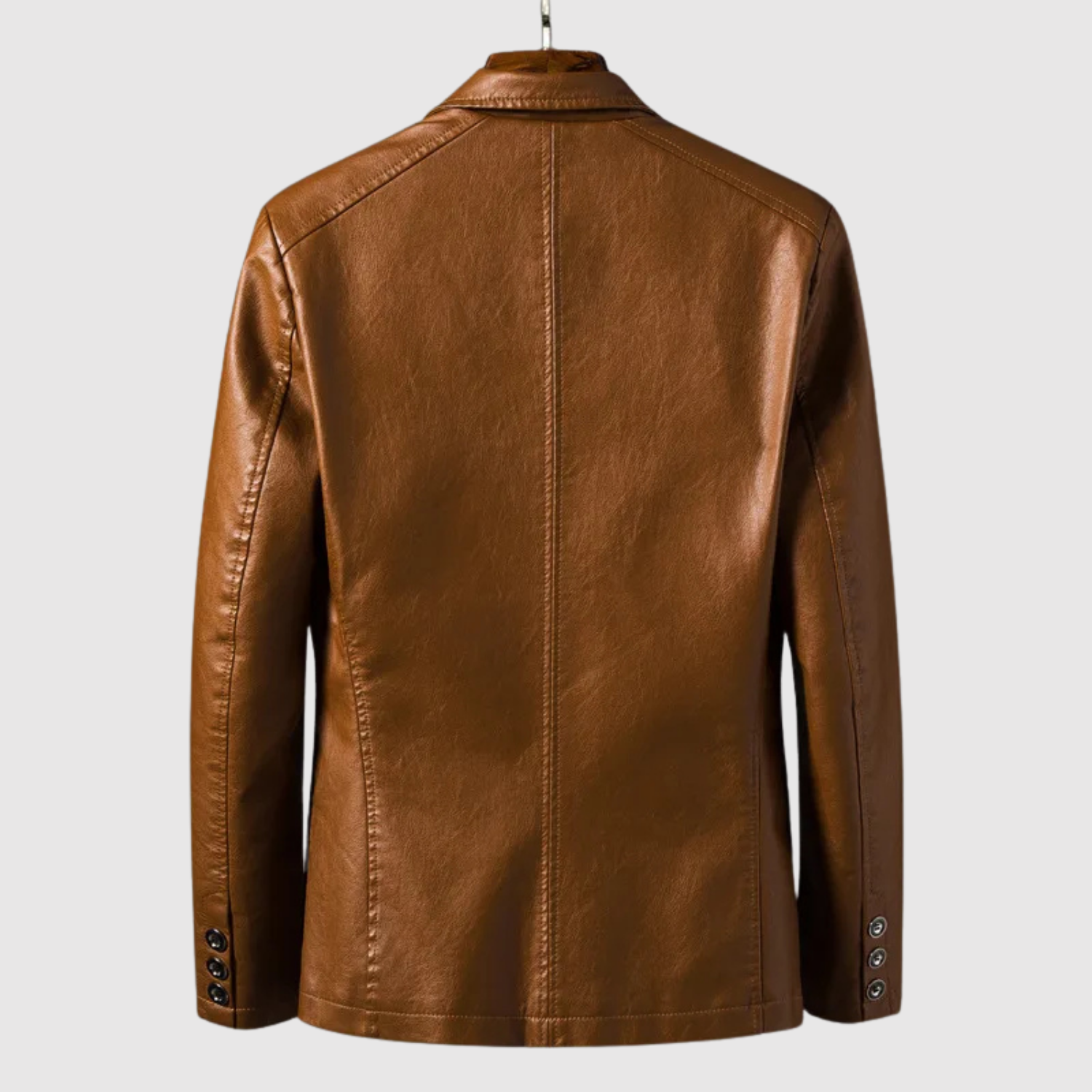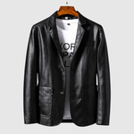 Този блейзър от изкуствена кожа комбинира структурирано мъжко шевно изкуство с уверена нагласа. Стегнатият крой, изразителните ревери и функционалните джобове създават визия, която балансира между изискан стил и груба характерност – перфектен за както неформални, така и официални поводи.