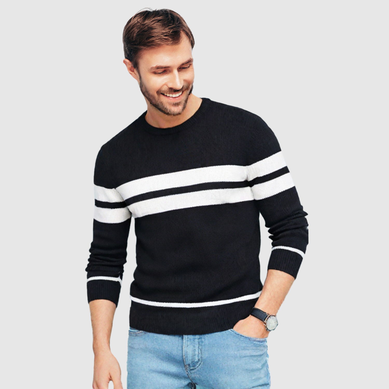 Вечен пуловер с двойни хоризонтални ивици, който придава спортен и модерен вид. Удобен е за носене в ежедневието, но достатъчно стилен, за да се носи на по-неофициални събирания.