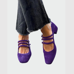 Тези лилави балерини с тройни ремъци комбинират елегантност с игриво излъчване. Квадратният нос и ниският ток осигуряват стабилност и комфорт през целия ден. Яркият цвят прави обувките стилно изявление, което повдига както ежедневни, така и празнични тоалети. Перфектен избор за теб, ако искаш модерен и уникален детайл в гардероба.