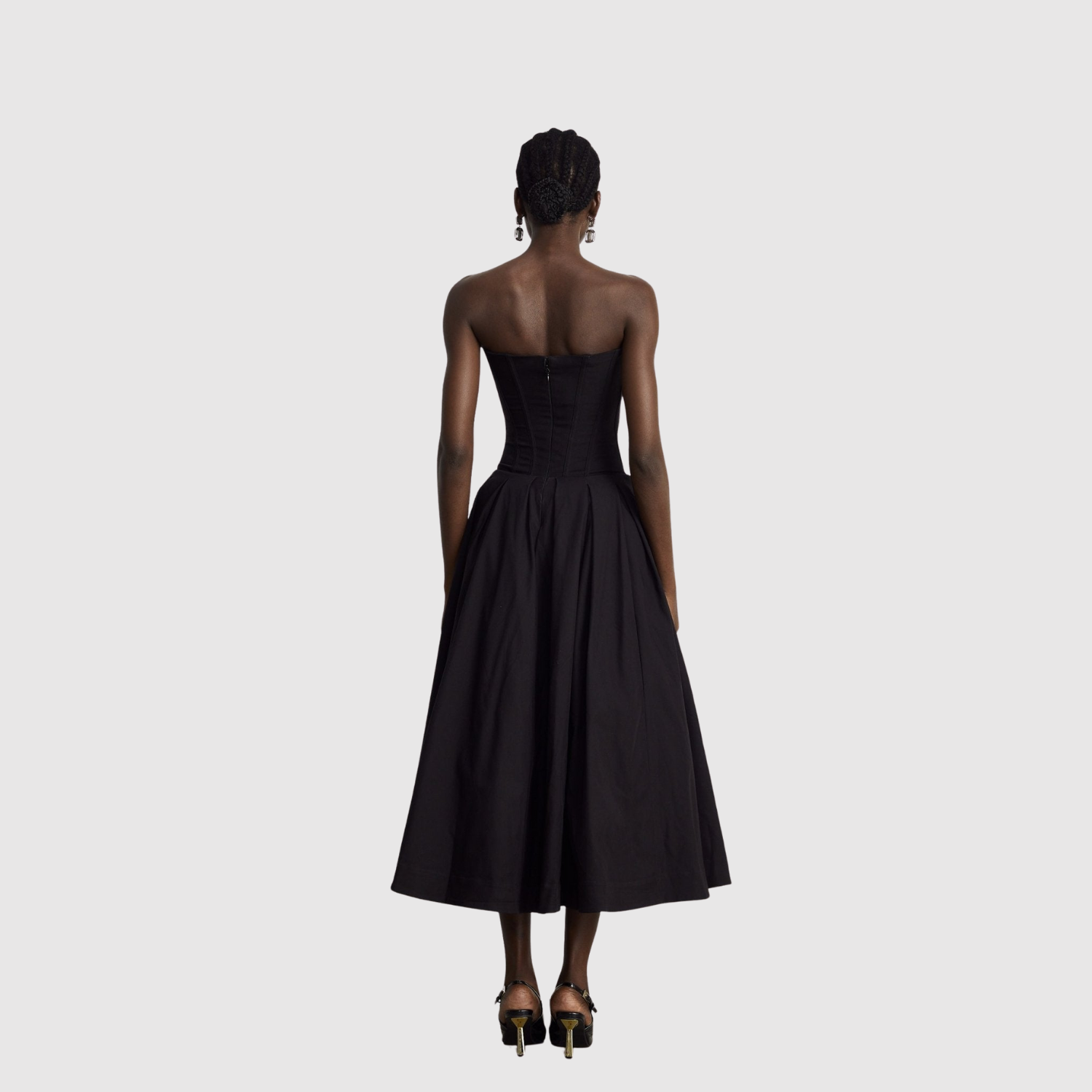 Класическа, безрамкова вечерна рокля в черно, създадена да впечатлява на всяко парти или специално събитие. С елегантния си силует и плавен пад дава изискано и вечнозелено излъчване. Перфектна както за формални събития, така и за стилни вечери навън.