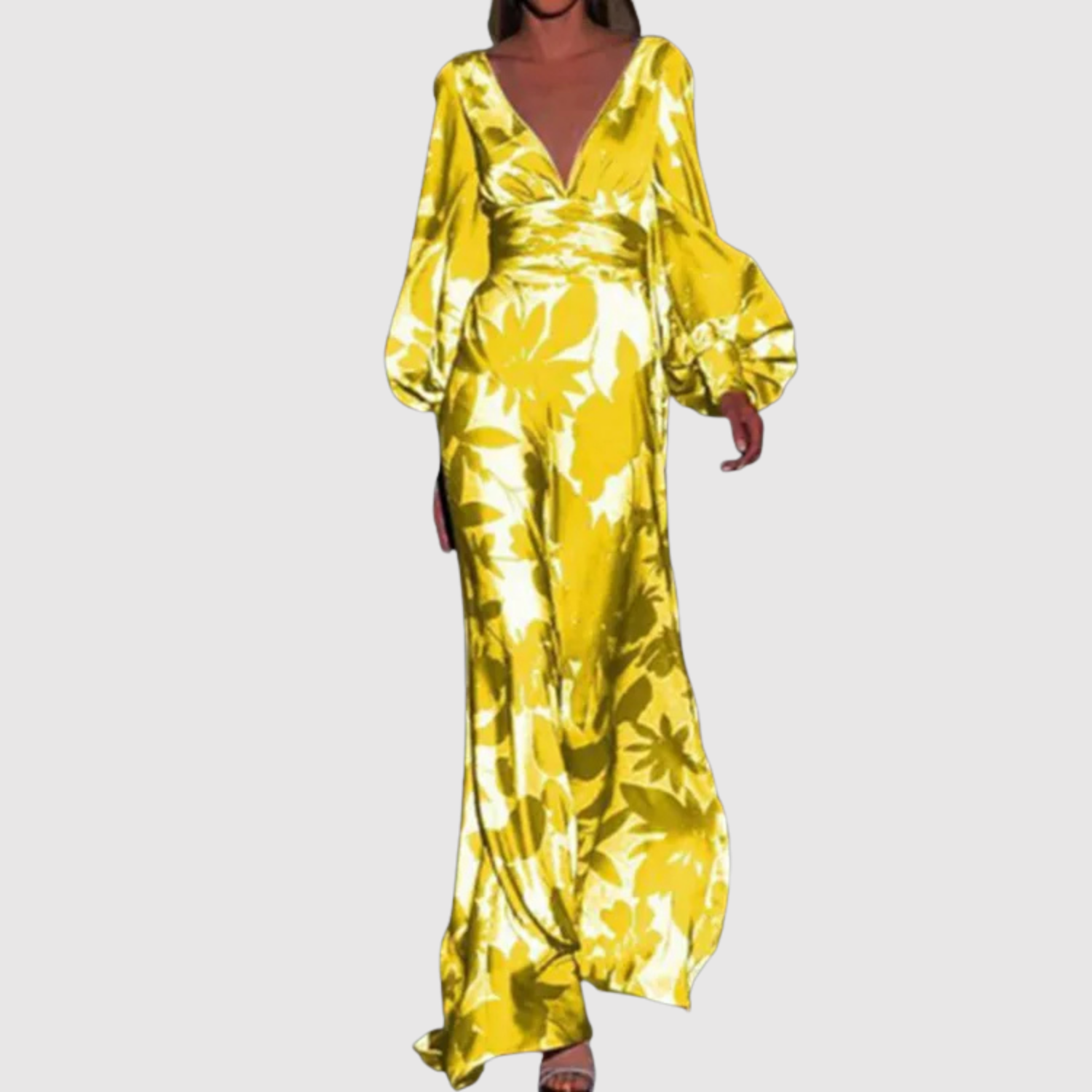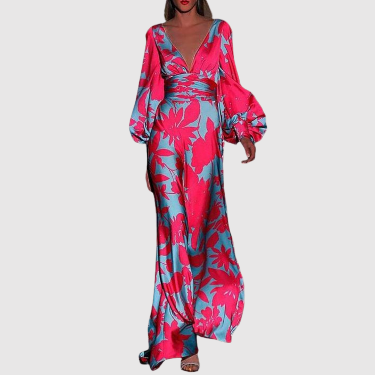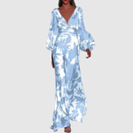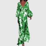 Макси рокля с живописен тропически принт, дълбоко V-образно деколте и дълги ръкави. Тъканта пада леко и елегантно, което я прави идеална за летни партита, ваканции или специални вечери, когато искате да се откроите с цветен и изискан вид.
