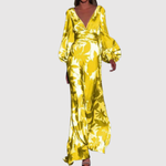 Лилия – Дълга рокля с тропически принт и дълбоко V-образно деколте