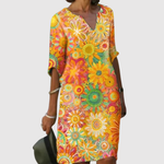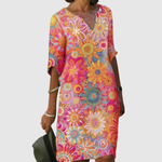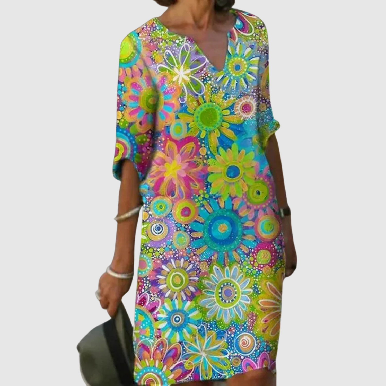 Лека и удобна лятна рокля с цветни цветни принтове, която излъчва радост и енергия. Перфектна за плажни излети, ваканции или спокойни летни дни. Тъканта е дишаща, което я прави идеална за слънчеви дни.