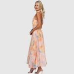 Роклята Блосом е идеалният избор за специални поводи или летни дни, когато искате да се откроите със стил. Миди-дългият кройка и елегантният халтер подчертават фигурата, докато мекото принт в пастелни цветове придава романтичен и изискан вид. Изработена от леко и течащо платно, което гарантира комфорт и свежест през целия ден.