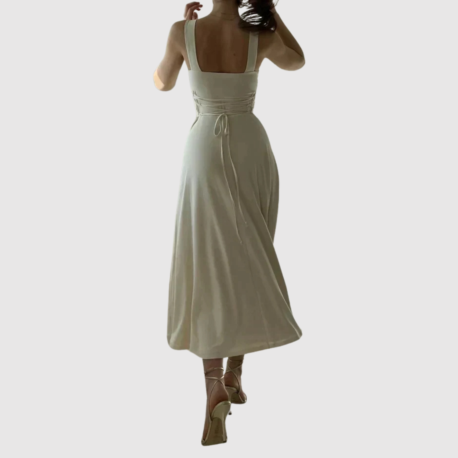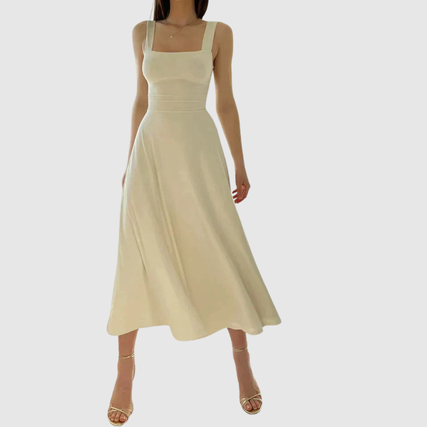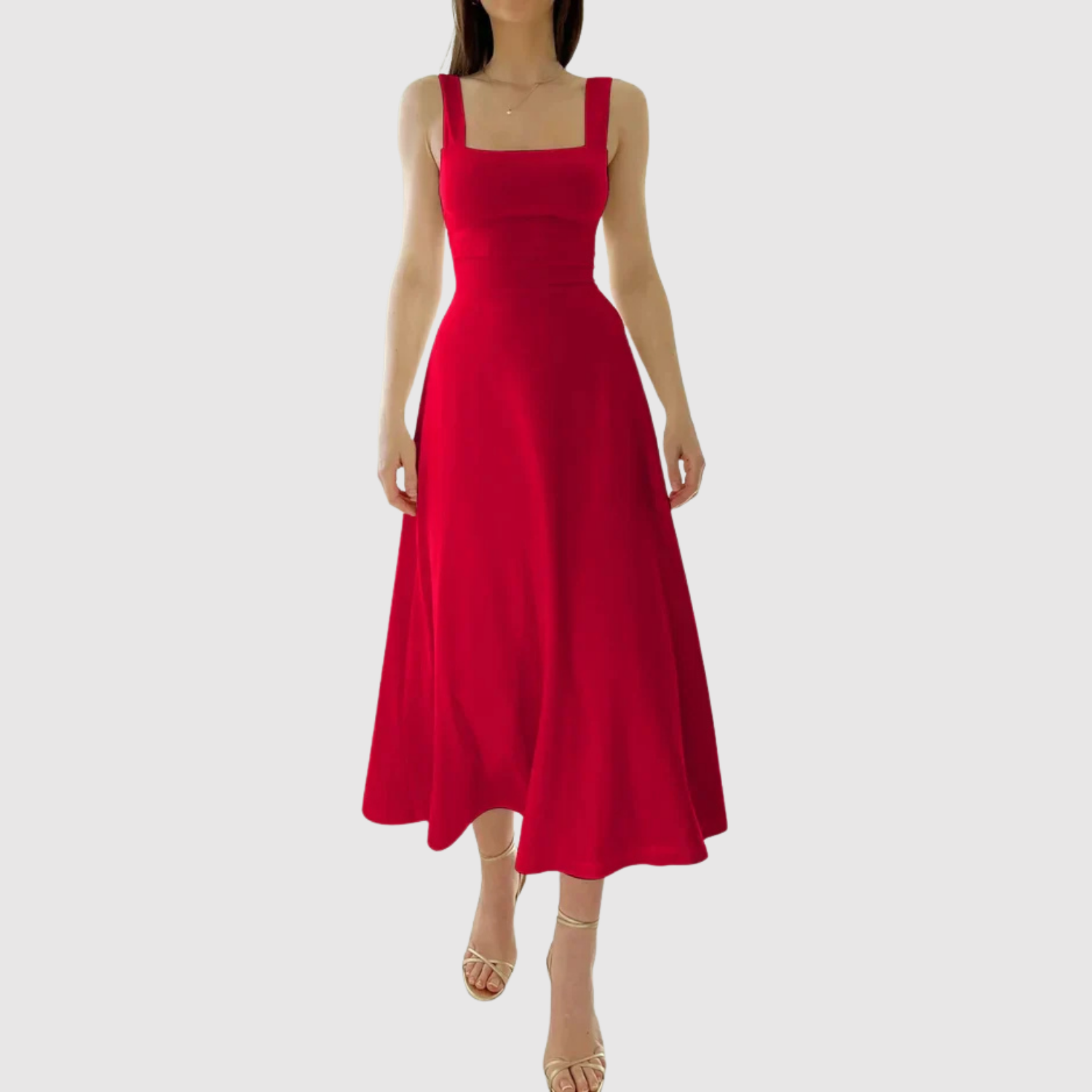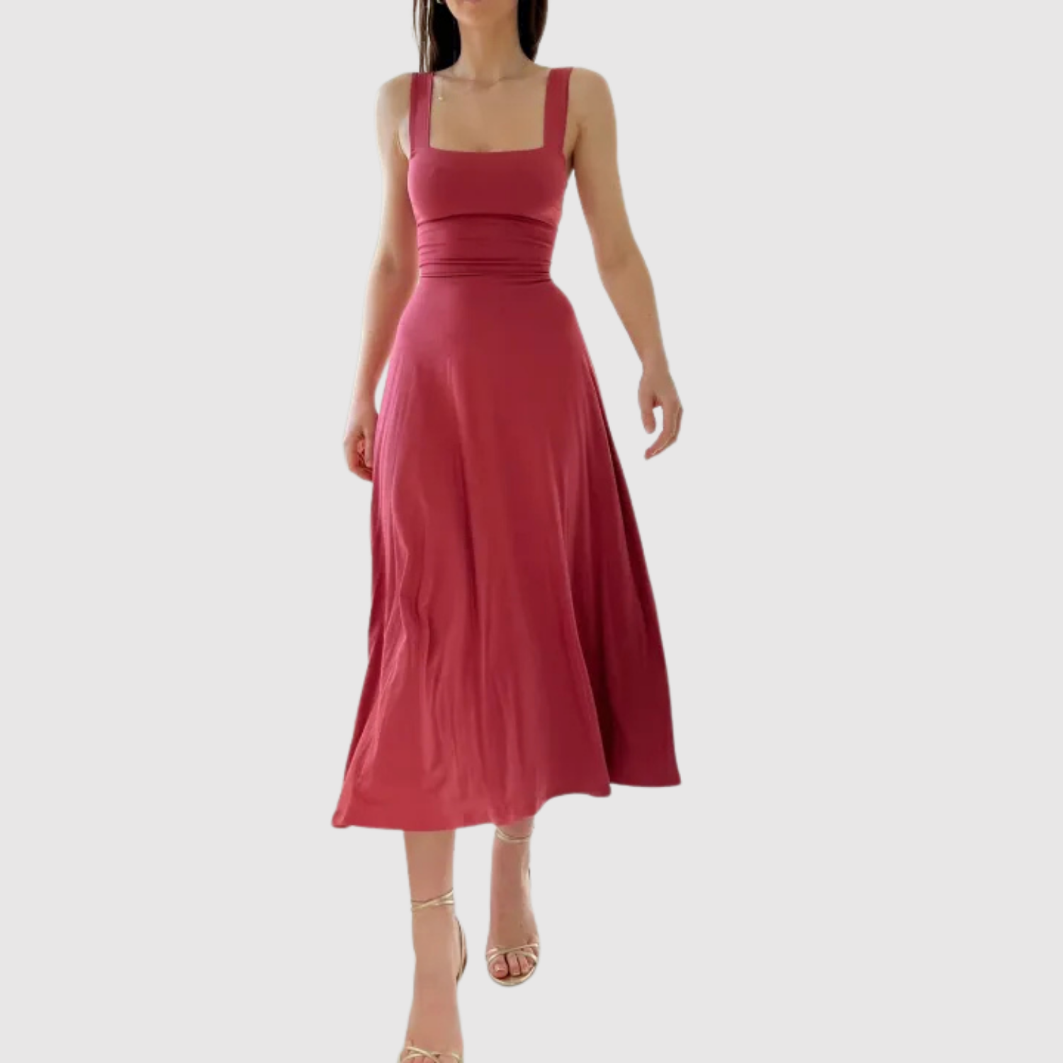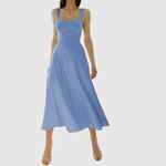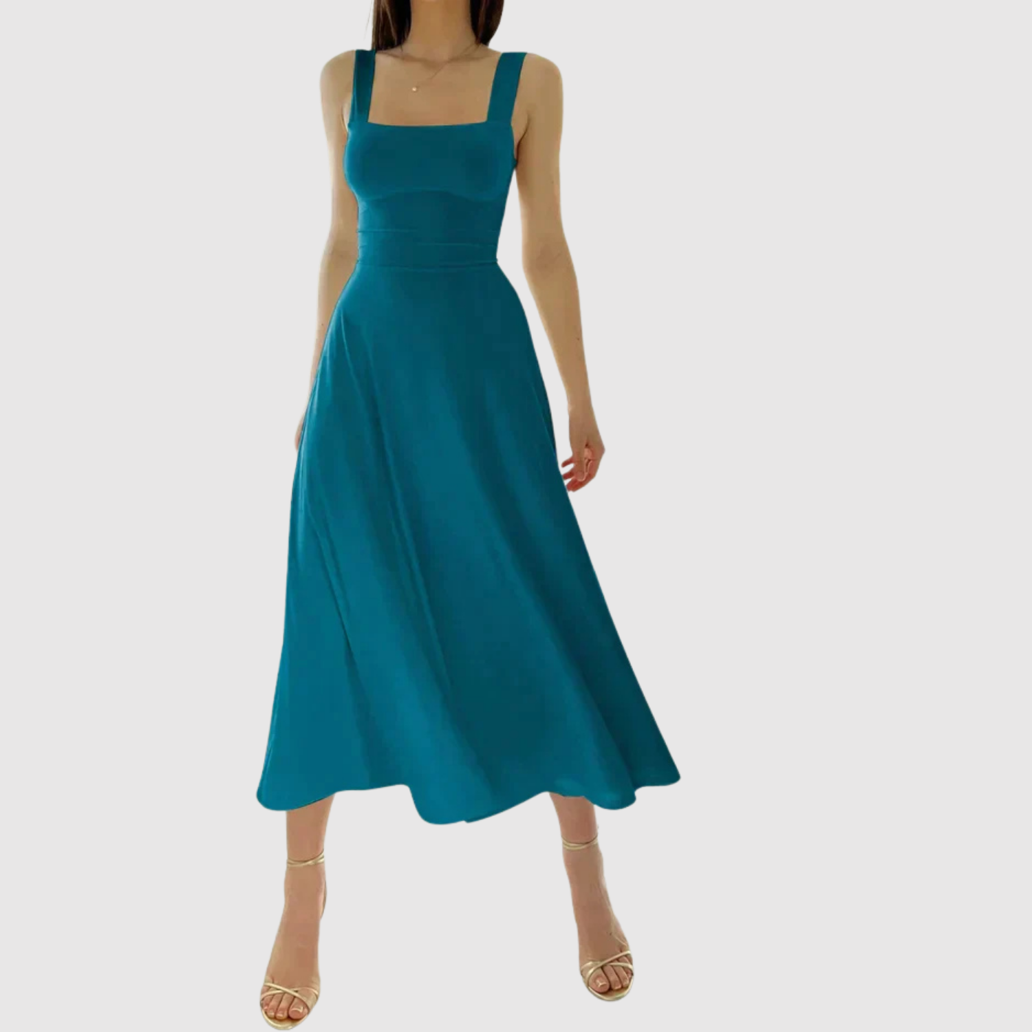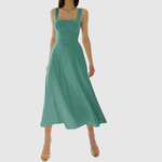 Вечна миди рокля с квадратно деколте и широки презрамки, която придава женствен и изискан вид. Плавният А-силует създава движение и комфорт, идеален за летни дни, сватби или елегантни вечери.