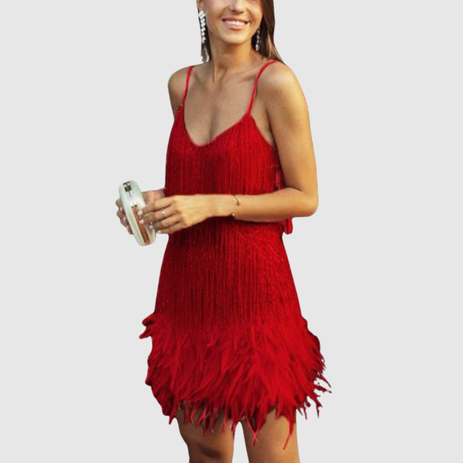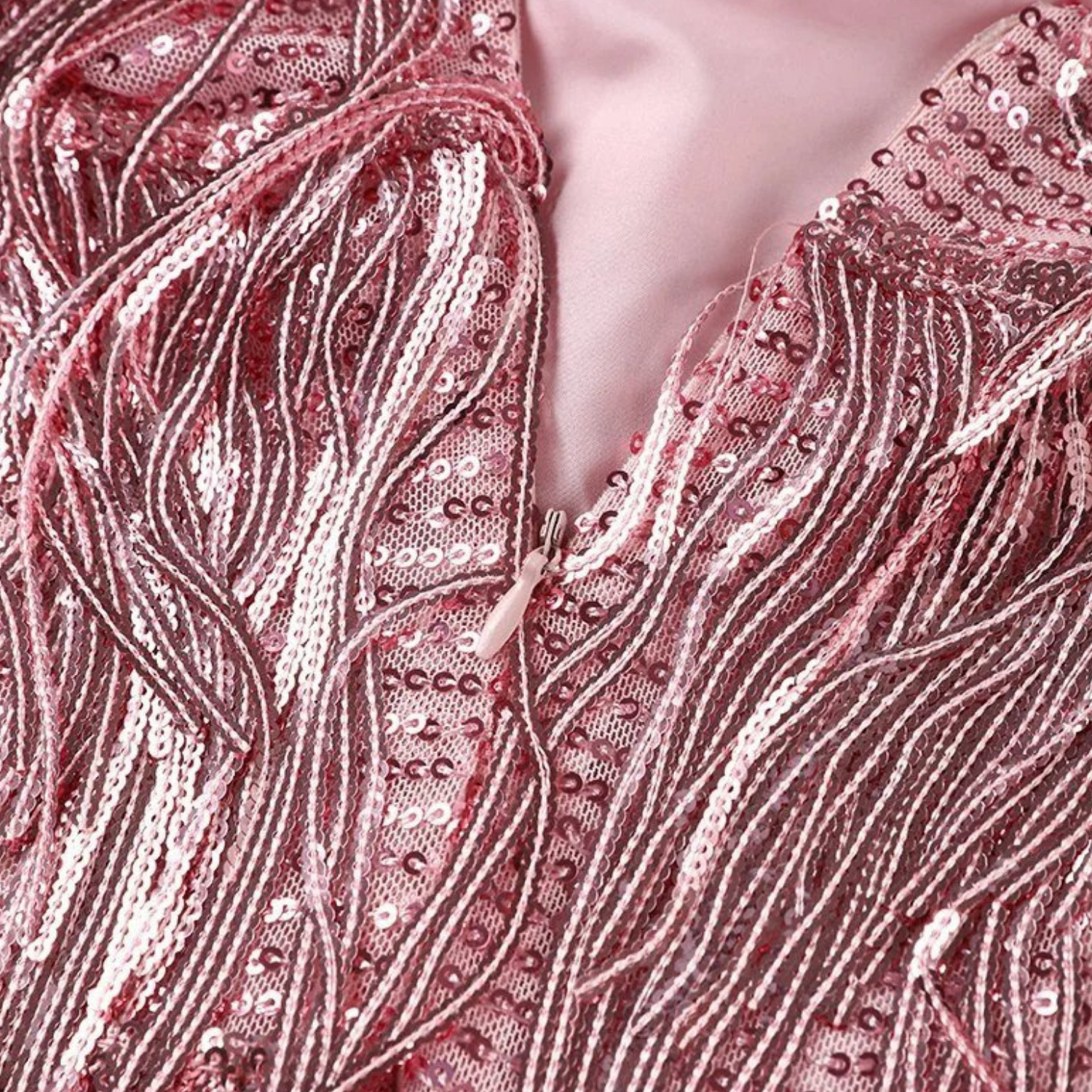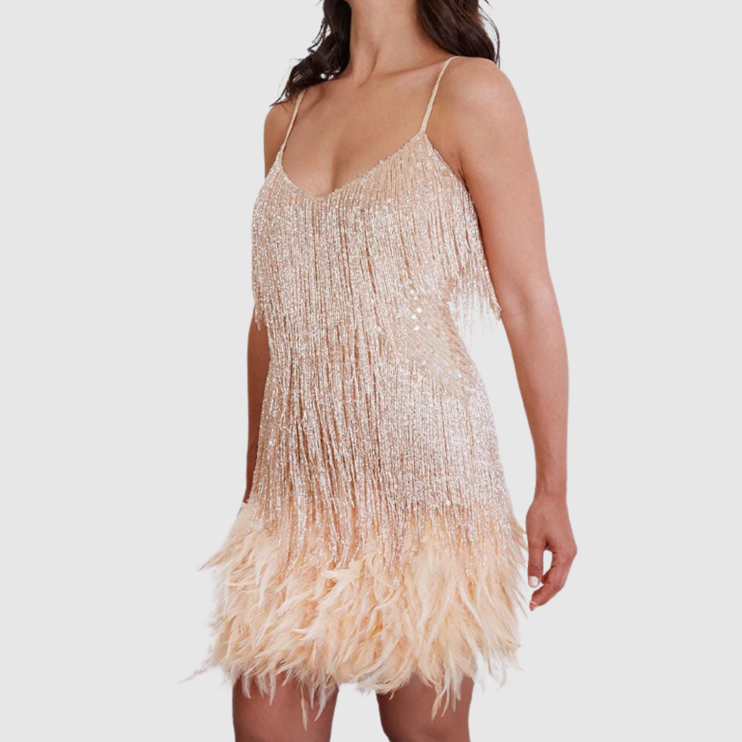 Иконична празнична рокля, проектирана с пластове ресни, които създават неустоимо движение с всяка стъпка. Тясната кройка подчертава фигурата, докато блестящият плат осигурява забележителен вид на всяко парти или събитие.