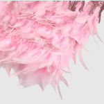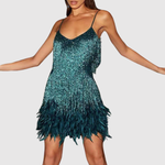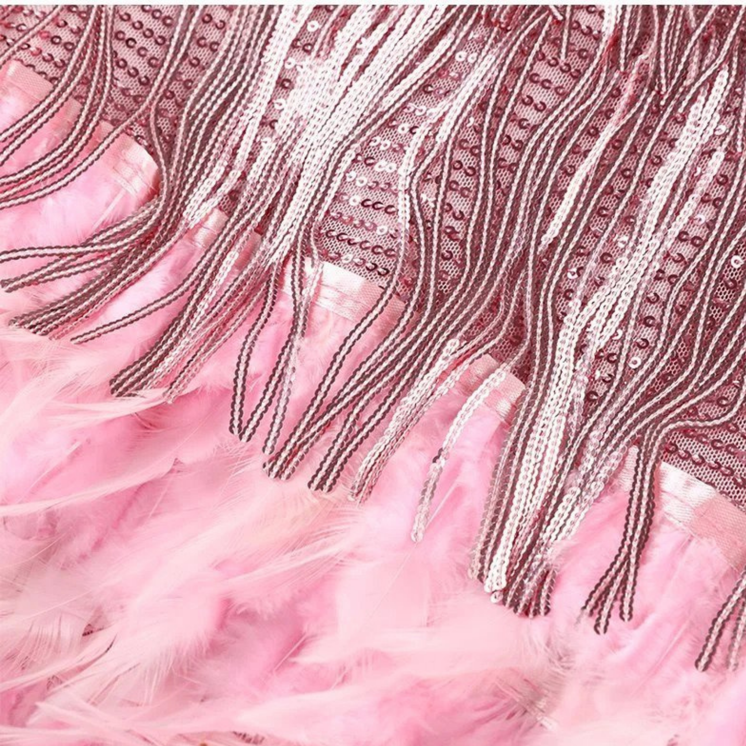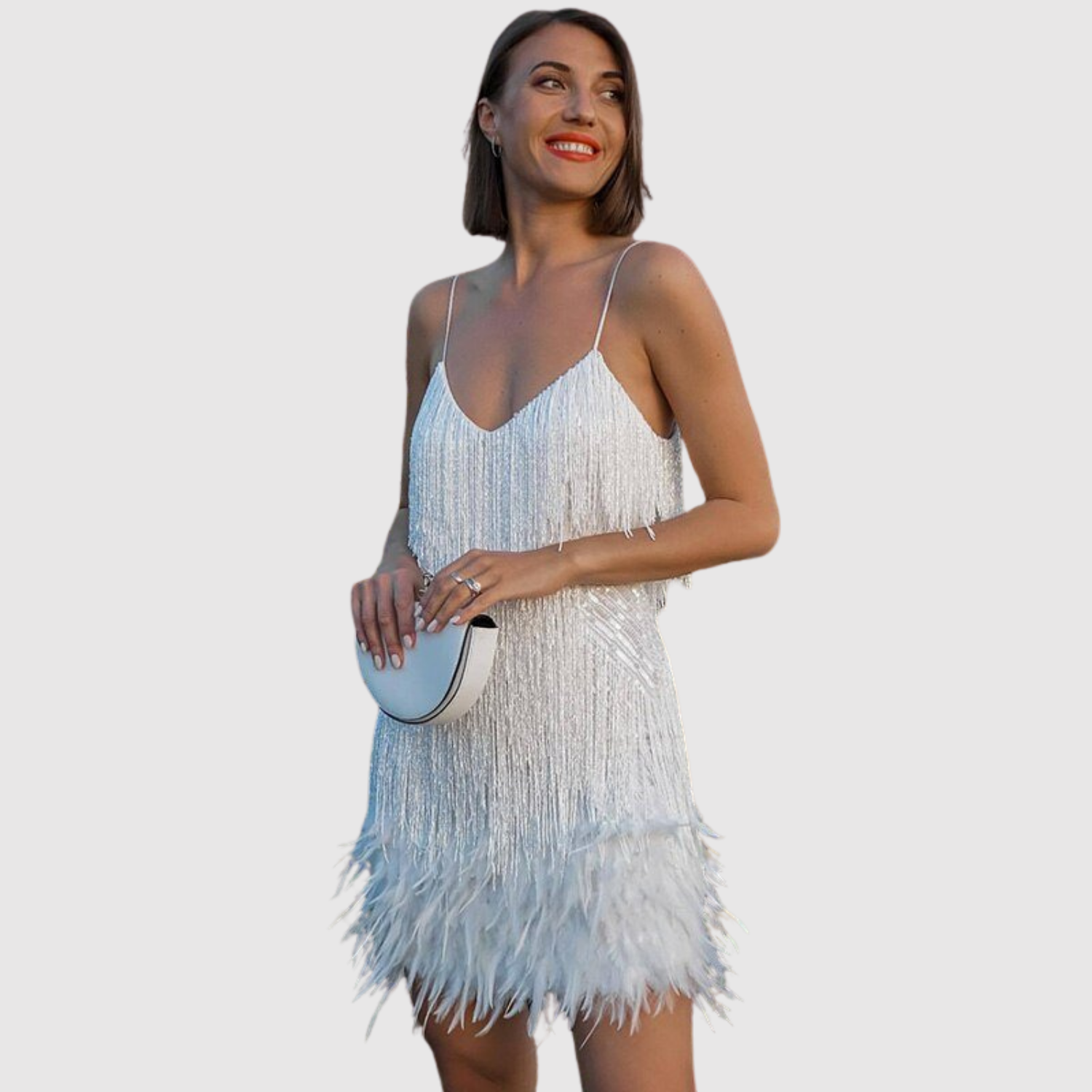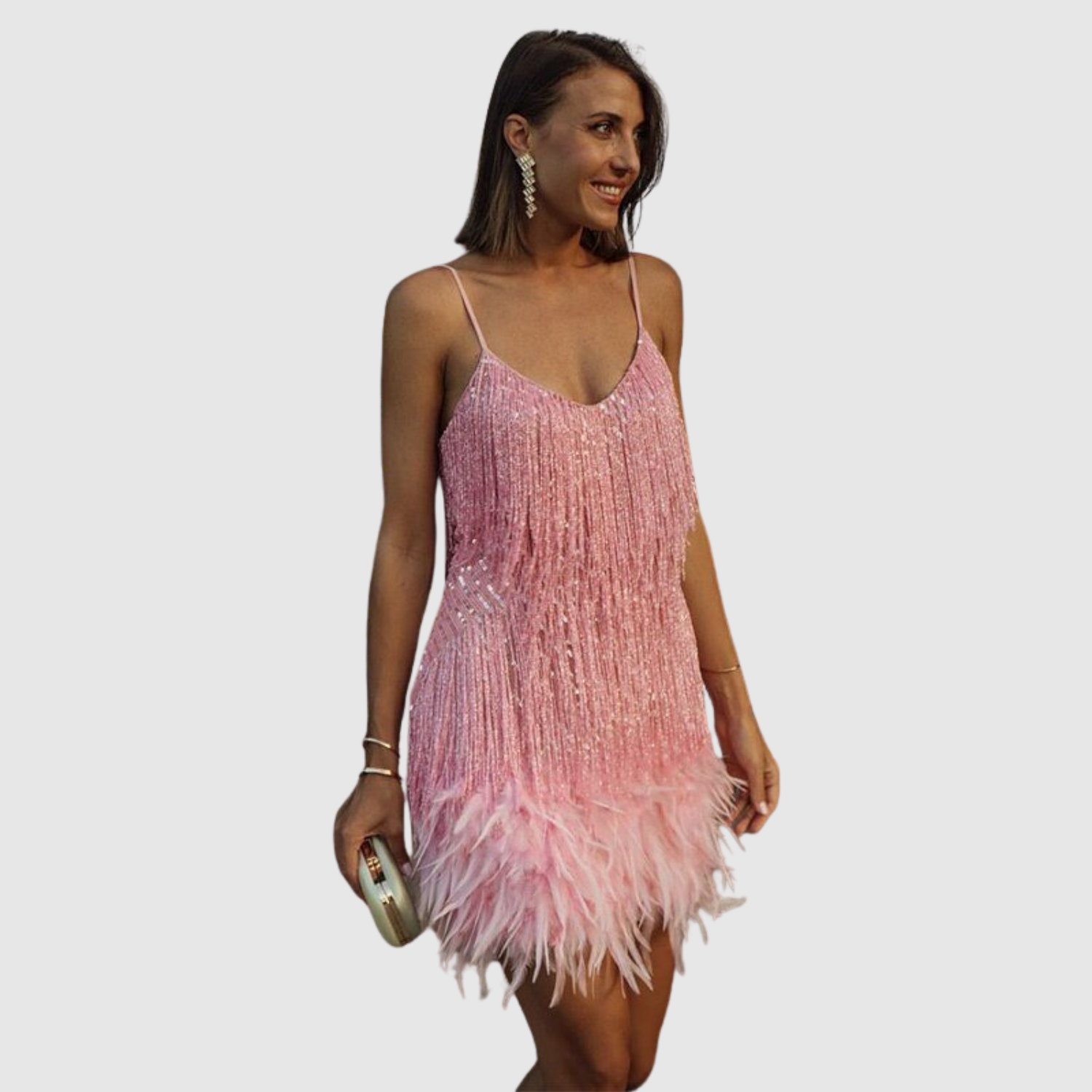 Иконична празнична рокля, проектирана с пластове ресни, които създават неустоимо движение с всяка стъпка. Тясната кройка подчертава фигурата, докато блестящият плат осигурява забележителен вид на всяко парти или събитие.