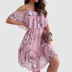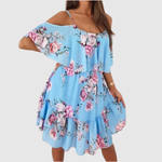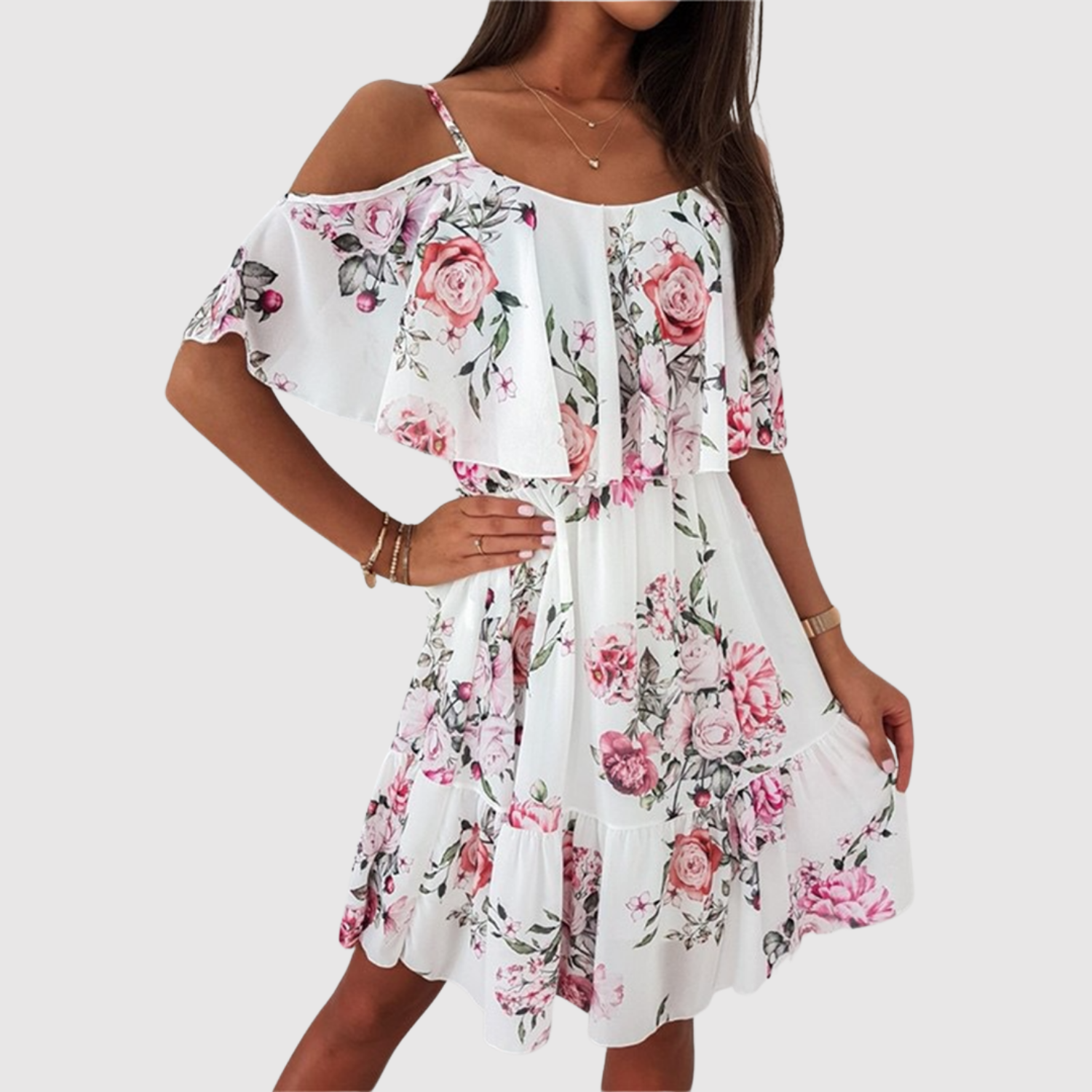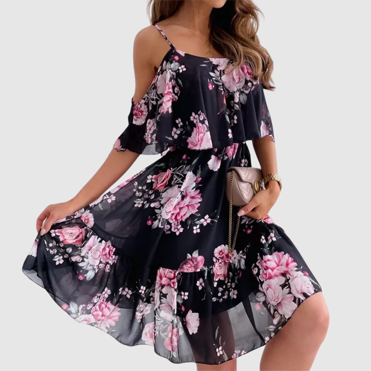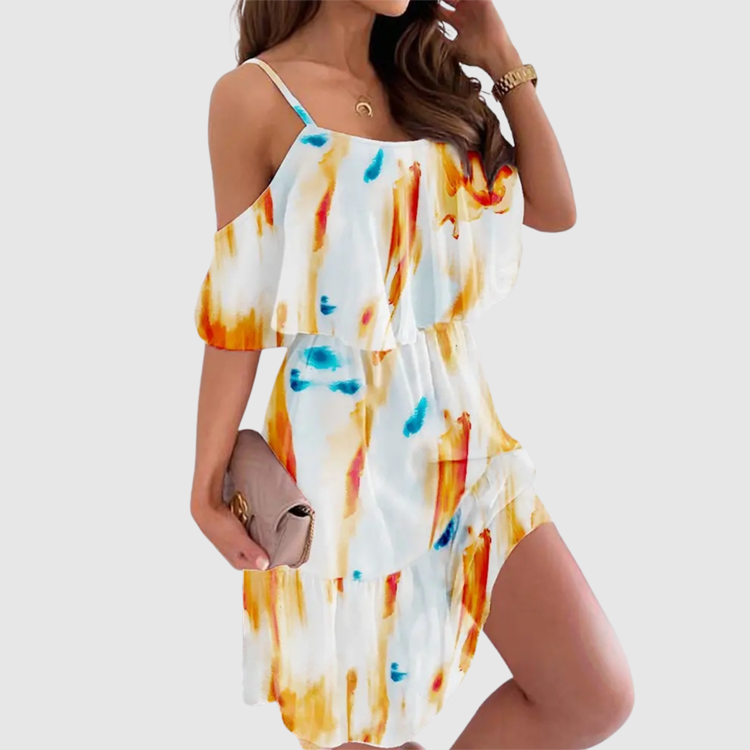 Тази рокля без рамене съчетава свободен силует с красив цветен принт. Материята е въздушна и удобна, което я прави перфектна за горещи дни, плажни излети или неформална вечер навън.