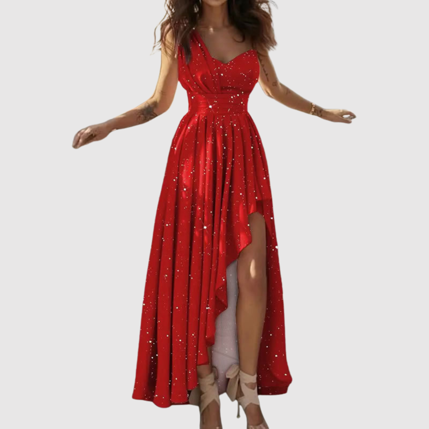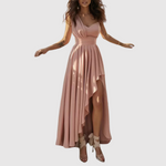 Тази макси рокля е проектирана с ласкателна деколте и елегантен разрез, който добавя софистициран вид. Идеална за партита, сватби и романтични вечери.